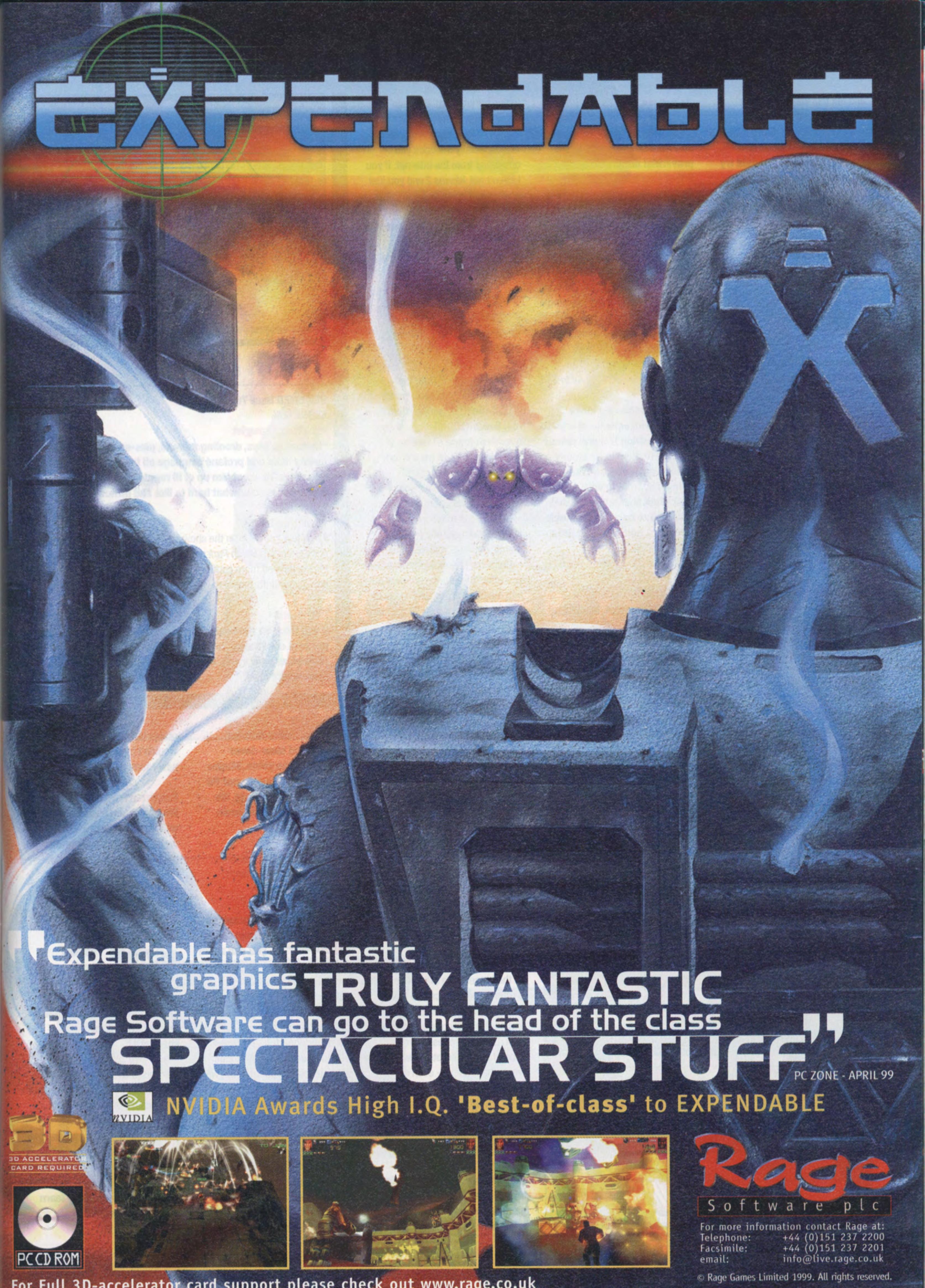 Considered by those who have played it as something of a reworking of the 1985 classic Capcom arcade game Commando, Expendable promises to continue Rage's role as the current 3D action game daddies. A fully playable version we encountered recently had simultaneous two-player action unfolding over a pseudo top-down landscape with a roving camera thrown in for good allround effect, and it seemed to work like a treat. Using a scriptable animating particle engine, the developers have improved the quality and quantity of their explosions, while their highly tuned polygon engine knocks up the complex 3D landscapes. As usual, Rage are utilising every technological trick in the book (force feedback, Voodoo 2) to ensure that this actioner kicks it with the best of them.
