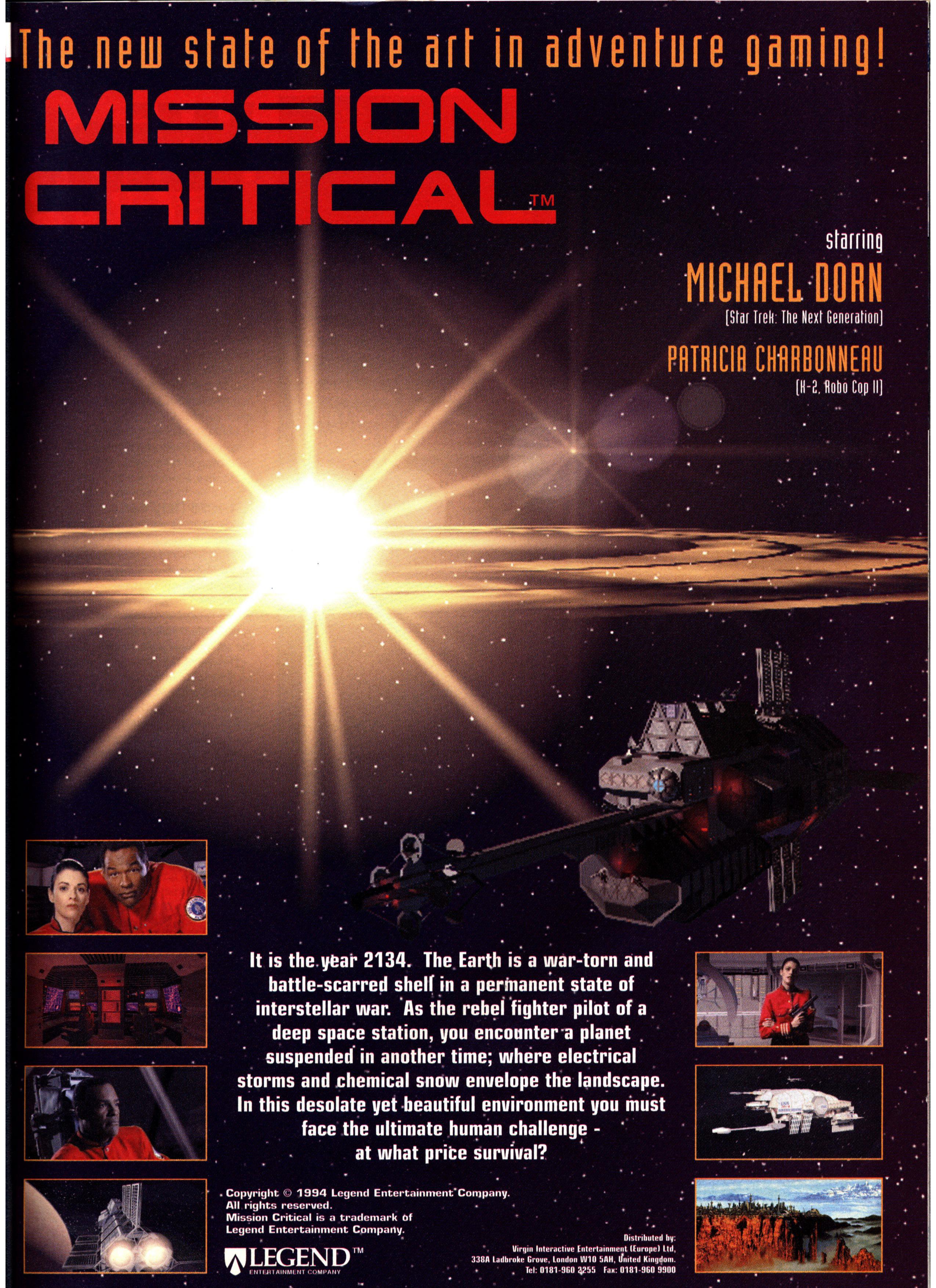 Well, a quick butchers at the screenshots (or a swift gander at the demo on this month's CD) should convince you that if there was an award for best looking thing on a cd, this would be a prime candidate. The svga graphics and rendered stuff is nothing short of gorgeous (Myst was never this nice), while Legend has gone to great pains to integrate the fmv footage as seamlessly as possible. The game 'stars' Michael Dorn (Mr Worf from Star Trek: The Next Generation) in the lead role and while it is being hailed as a next generation interactive epic, team spokesperson Mike Verdu maintains that Mission Critical will not be yet another CD-ROMbo full of fancy graphics and window dressing: "We're particularly proud of the story in that it tries to answer big philosophical questions while also being entertaining. If bio-mechanical machines were ever to climb higher up the evolutionary scale than humans, would we try to stop them or peacefully co-exist?"