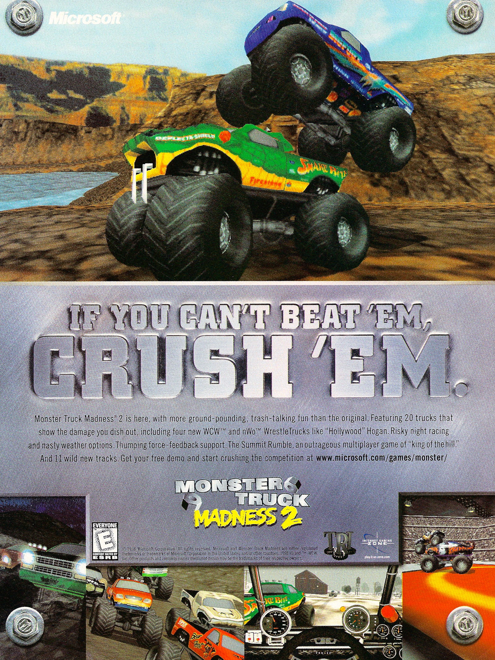 With tons of mud flinging, bumper crunching and rubber-burning action, Monster Truck Madness 2 is a definite must-see for racing fans. The updated graphics, new truck and tracks, and increased multiplayer support make MTM2 a must have for fans of the original.