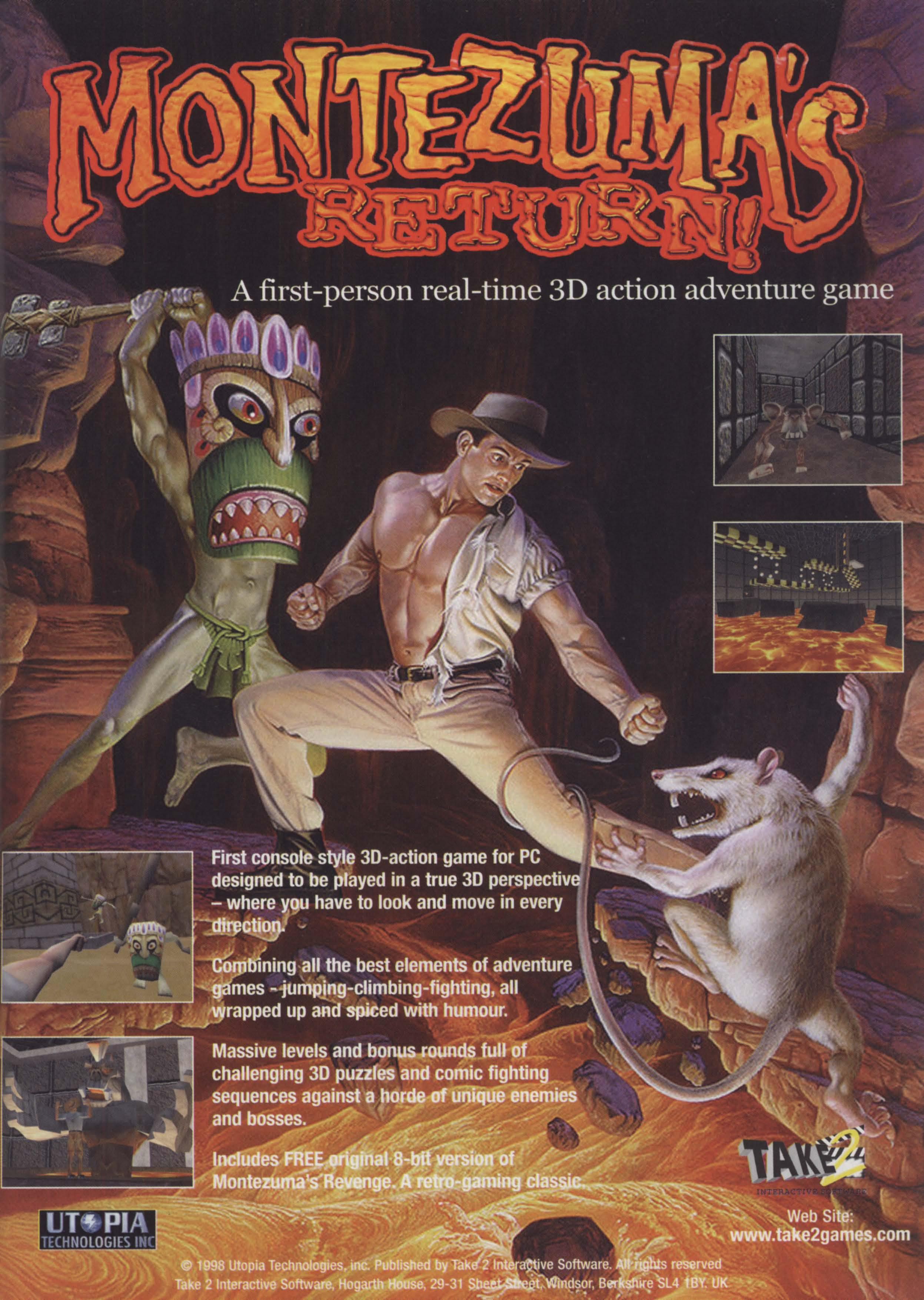 Old-timers may recall Montezuma's Revenge, the famed 8-bit action/adventure game that graced home computers in the mid-'80s. Now Montezuma Max is back, sporting an all-new 3D look and dozens of hours of gameplay. Exploring Aztec ruins from a first-person Quake-style perspective, you battle tigers, dragonflies, giant rats, Aztec warriors, and more all without the aid of a weapon. There are no guns and no blood in this game, so you'll have to rely on your fists, your reflexes, and your quick thinking to solve the puzzles and get out alive.