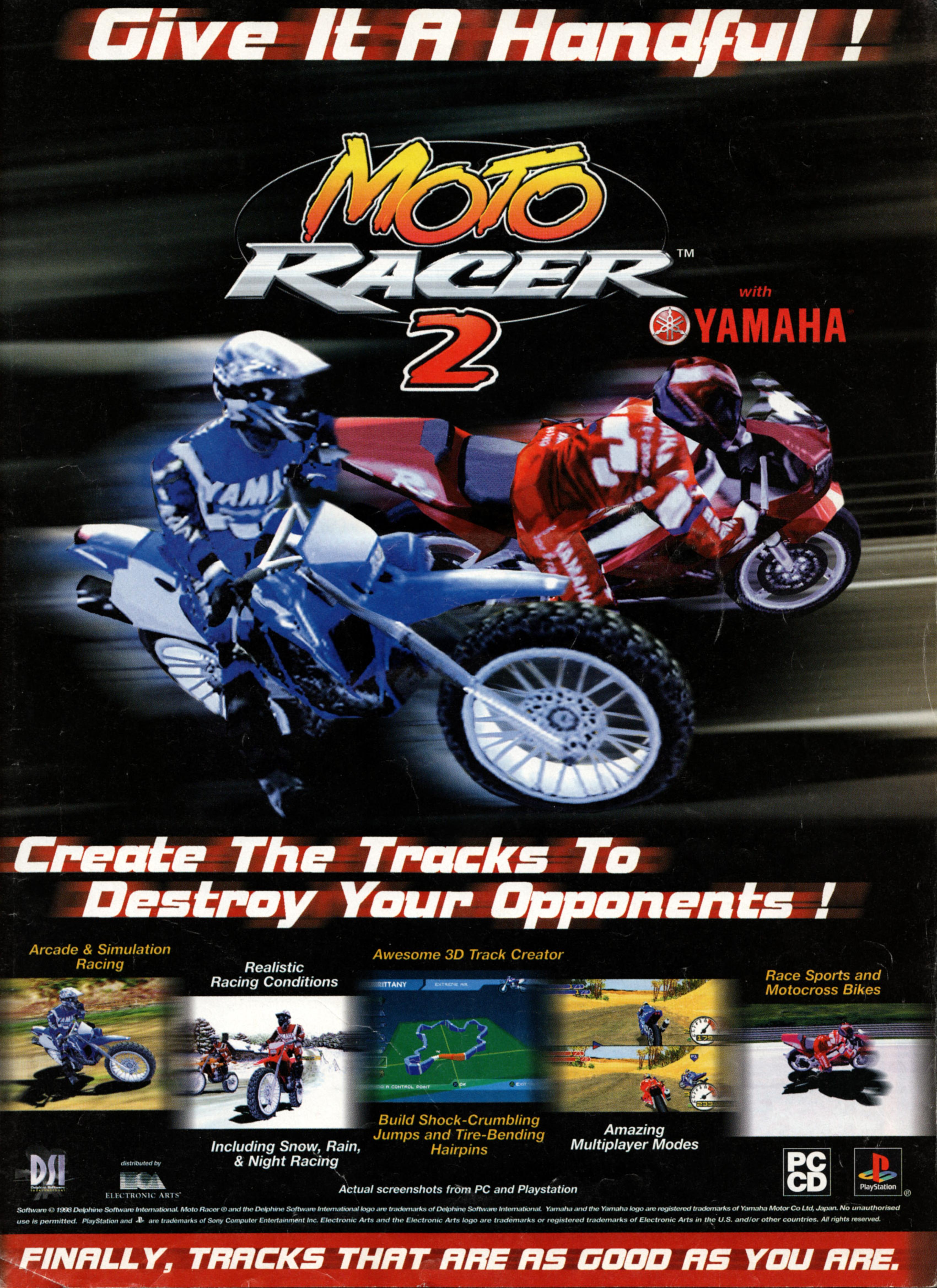Up until Moto Racer came around, good bike racing games on the PS were a fantasy. Now, Moto 2's out, and once again, it outshines all of its competition (VMX, McGrath), which isn't too difficult a feat. This game is fast--I'm glad the game has invisible track walls to keep my bike on the road. The intuitive track editor is a nice addition. This is a fun, action-oriented racer--don't expect a sim, even with the game's Simulation Mode.