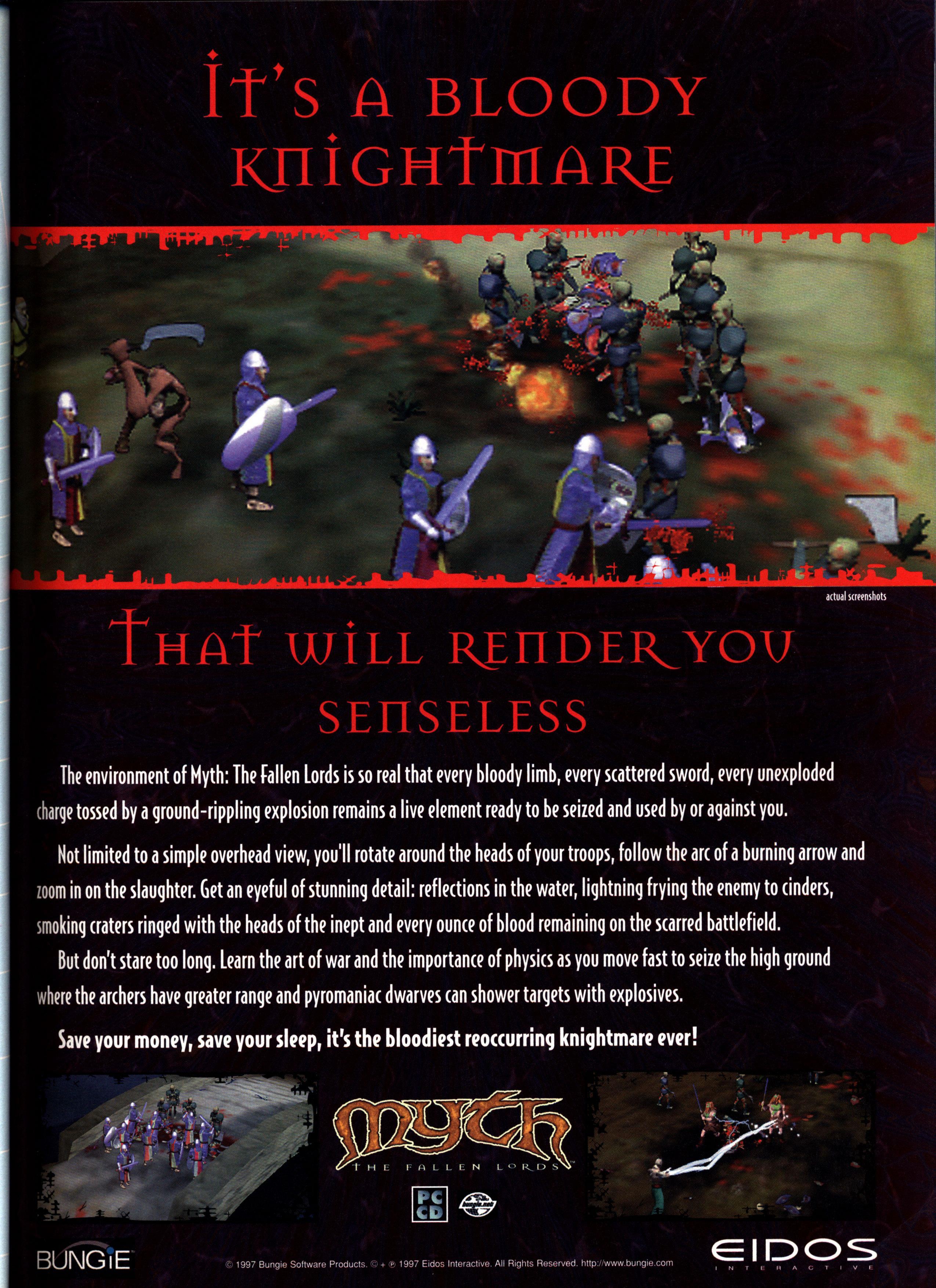 Two things have traditionally kept PC gamers riveted to their keyboards: Game-play and gore. Bungie utilizes both to the fullest in its tactical masterpiece, Myth: The Fallen Lords. Myth blows away any current real-time strategy game available today. It simply does everything right.