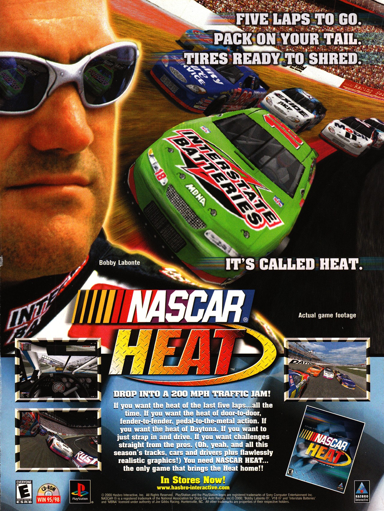 Hasbro isn't taking the responsibility of the NASCAR license lightly. NASCAR Heat is planned for a holiday release and looks great! Currently the game runs at a nice, smooth framerate (better than NASCAR 2001), but it must be said that there are only eight cars on the track right now. Bobby Labonte, 2000 Winston Cup contender, is the chief technical advisor on the game. Besides multiplayer, single race and championship modes, NASCAR Heat features a Beat the Heat option which recreates some of the most thrilling moments in various drivers' careers for the player. At this point it's hard to tell if Heat is meant to be a hardcore simulator or an arcade game, but we should have a better idea of its direction in the coming months. Just wait until you see the planned Playstation 2 version in 2001!