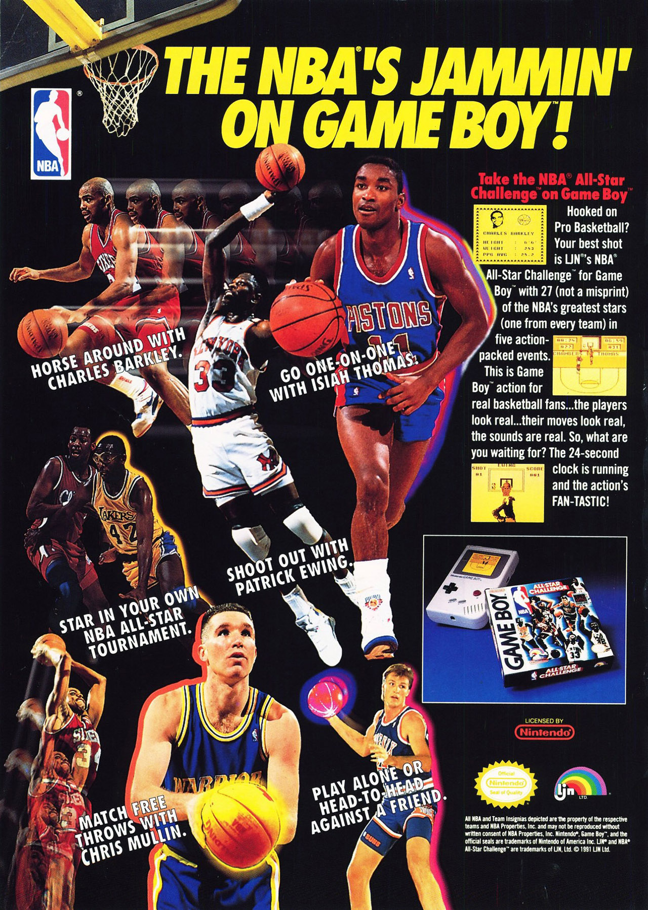 Hooked on Pro Basketball? Your best shot is LJN's NBA AII-Star Challenge for Game Boy with 27 (not a misprint) of the NBA's greatest stars (one from every team) in five action-packed events.