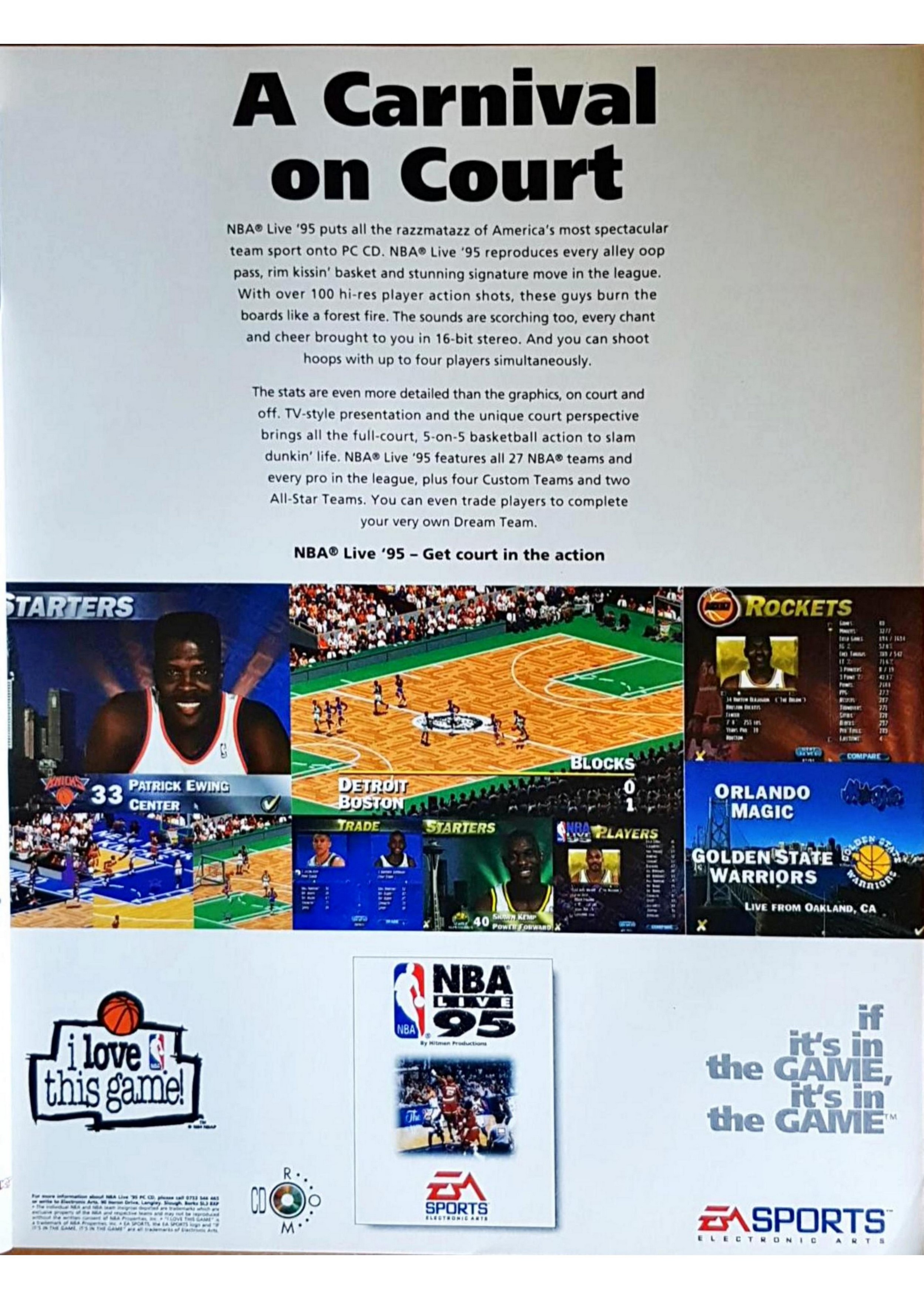 What separates EA Sports from most other companies is its emphasis on realism, and NBA Live '95 for the SNES ranks among the top hoops-simulation games. It improves on last year's NBA Showdown with better graphics, more in-depth strategy, and more realistic game play.