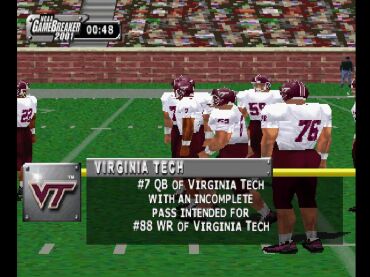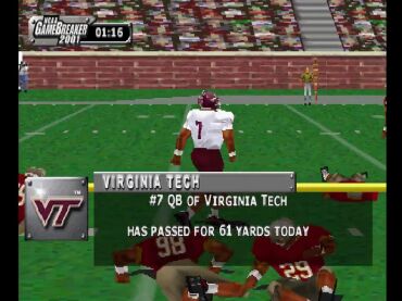 Players don't go down after the first hit. Often after a shuffle or a glancing blow they're moving down field again. It's definitely entertaining to watch. In general it seems like the special moves are more effective too. The once-cumbersome "super-move" controls have been simplified to a double tap. Time your juke, spin, stiff-arm and jump and you're racking up big running yards in no time. The college atmosphere is helped along by 30 new fight songs, play-by-play from the king of college football--Keith Jackson and 60 more historic teams. Currently 989 is fixing a few bugs but they promise GB 2001 will make its August release date.