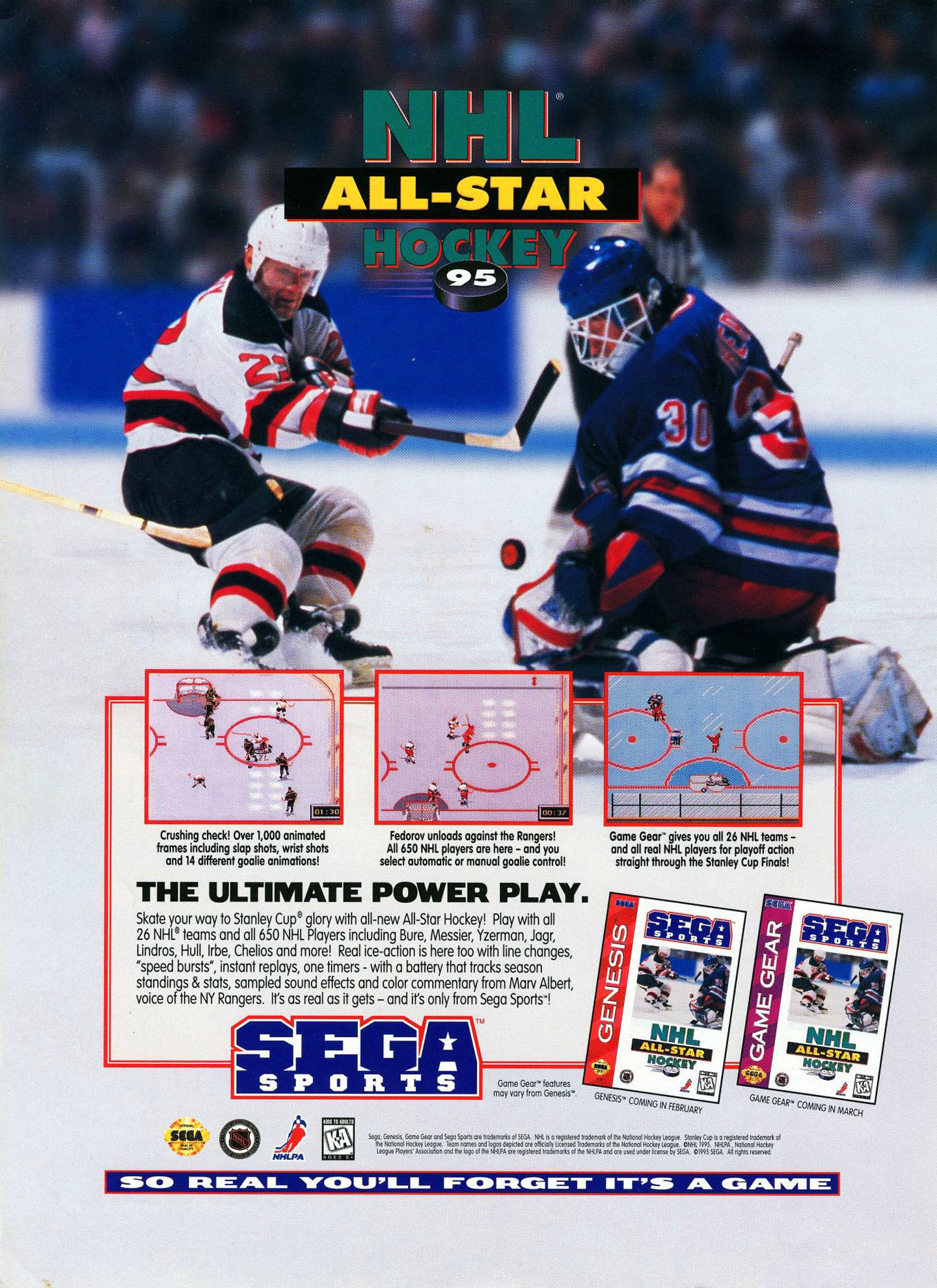 Skate your way to Stanley Cup glory with all-new All-Star Hockey! Play with all 26 NHL teams and all 650 NHL Players including Bure, Messier, Yzerman, Jagr, Lindros, Hull, Irbe, Chelios and more! Real ice-action is here too with line changes, "speed bursts", instant replays, one timers - with a battery that tracks season standings & stats, sampled sound effects and color commentary from Marv Albert, voice of the NY Rangers. It's as real as it gets - and it's only from Sega Sports!