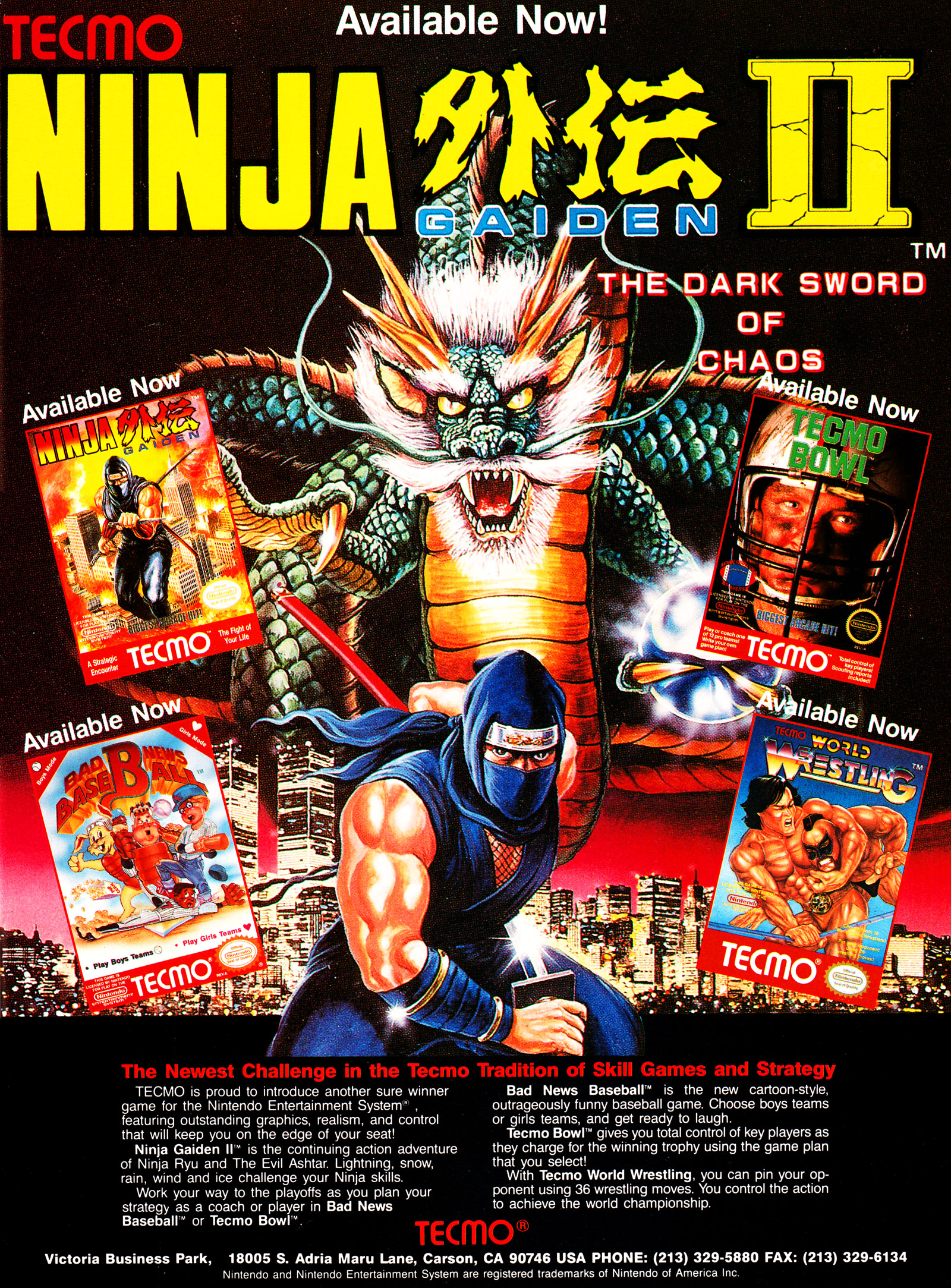 This blockbuster sequel to the current number one Nintendo game of 1989 continues the adventures of the master Ninja, Ryu. All new levels of play, power-ups, and an explosive story that's loaded with twists and turns guarantee a fun-filled 1990 from Tecmo!