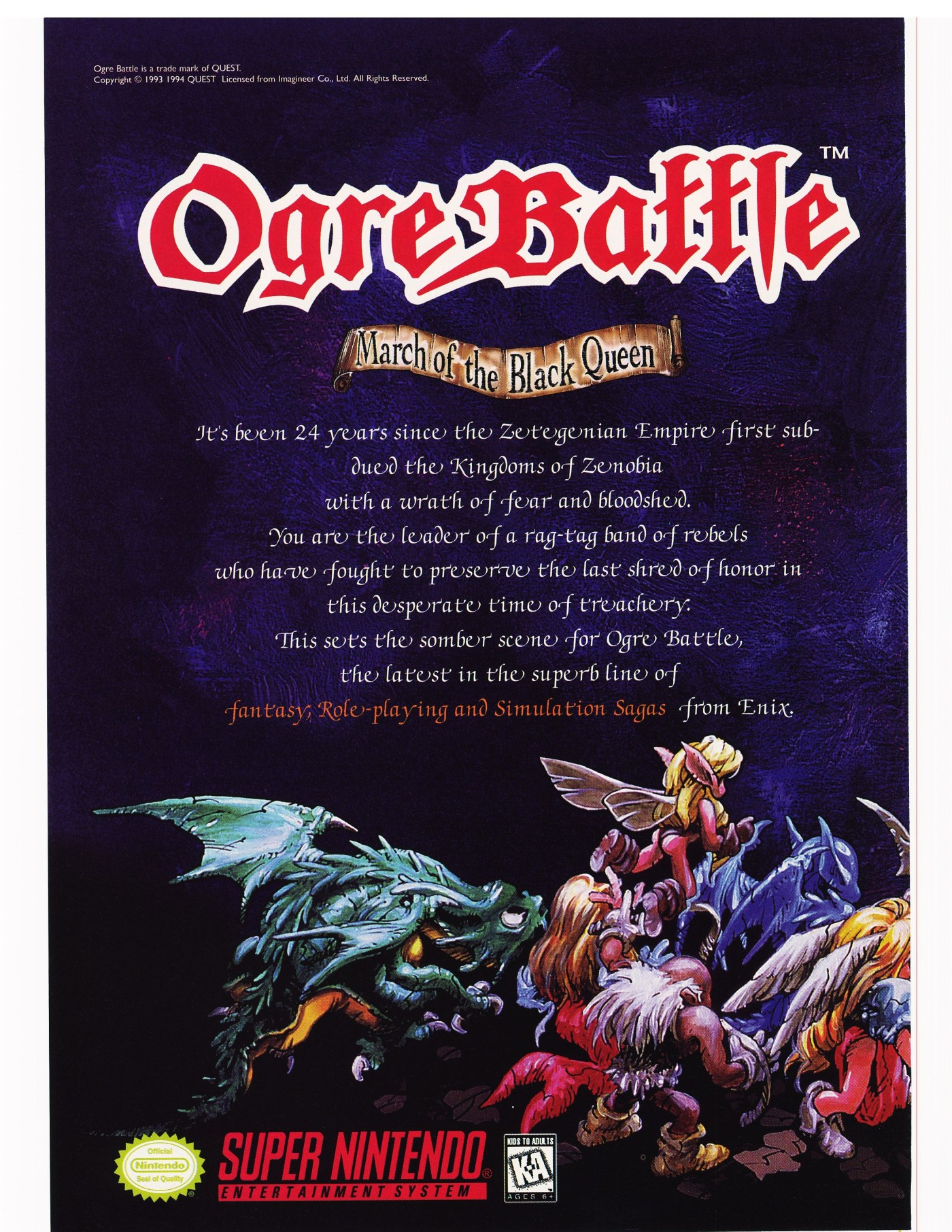 Ogre Battle is a real-time strategy role-playing video game released in 1993 for the Super Nintendo Entertainment System (SNES). The game is the first installment of the episodic series and was developed by Quest for the Super Farmicon originally, and also for Sega Saturn later on, in 1996.