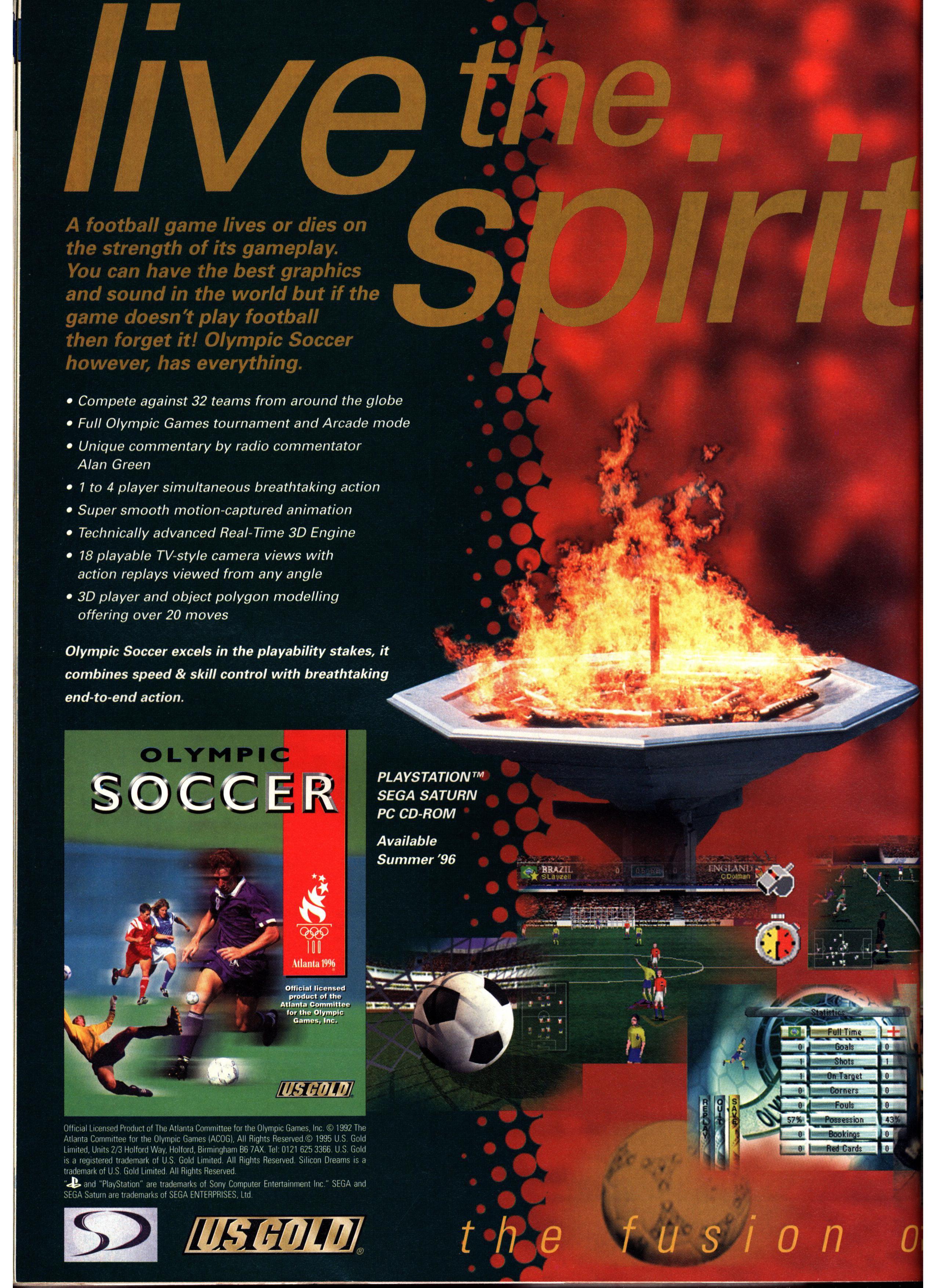 Making a game that duplicates that intense spirit, as well as provide realistic gameplay, is no simple feat--but U.S. Gold is up to the challenge with Olympic Soccer, the last of the company's three official 1996 Centennial Olympic Games sports titles.
