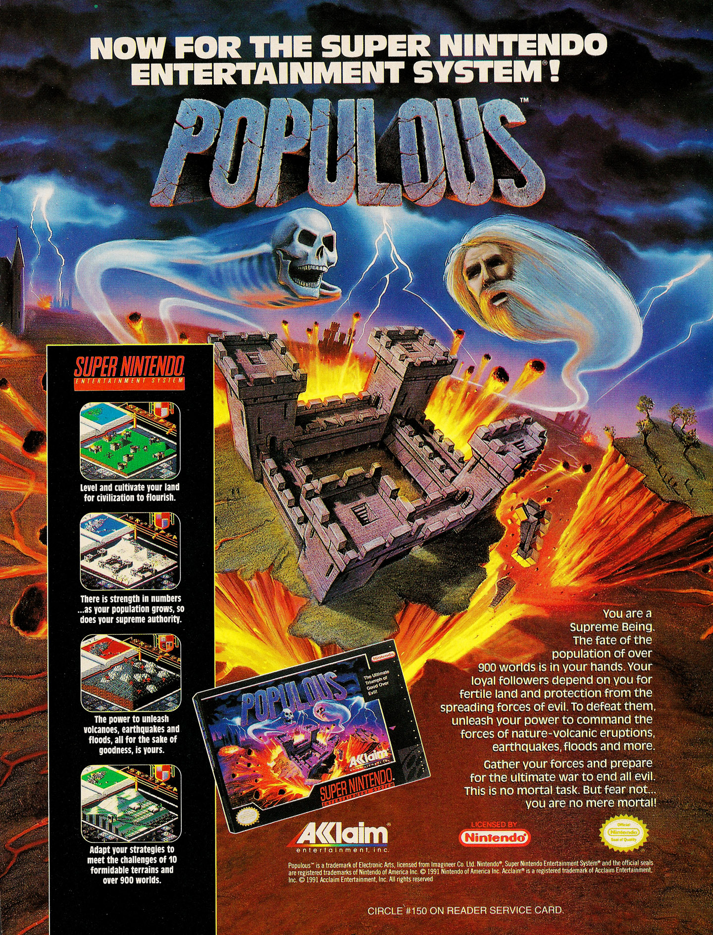 Electronic game players are all familiar with Populous. This game started on the Amiga and ST, moved to other computer formats, then to the Sega Genesis and now the SF.