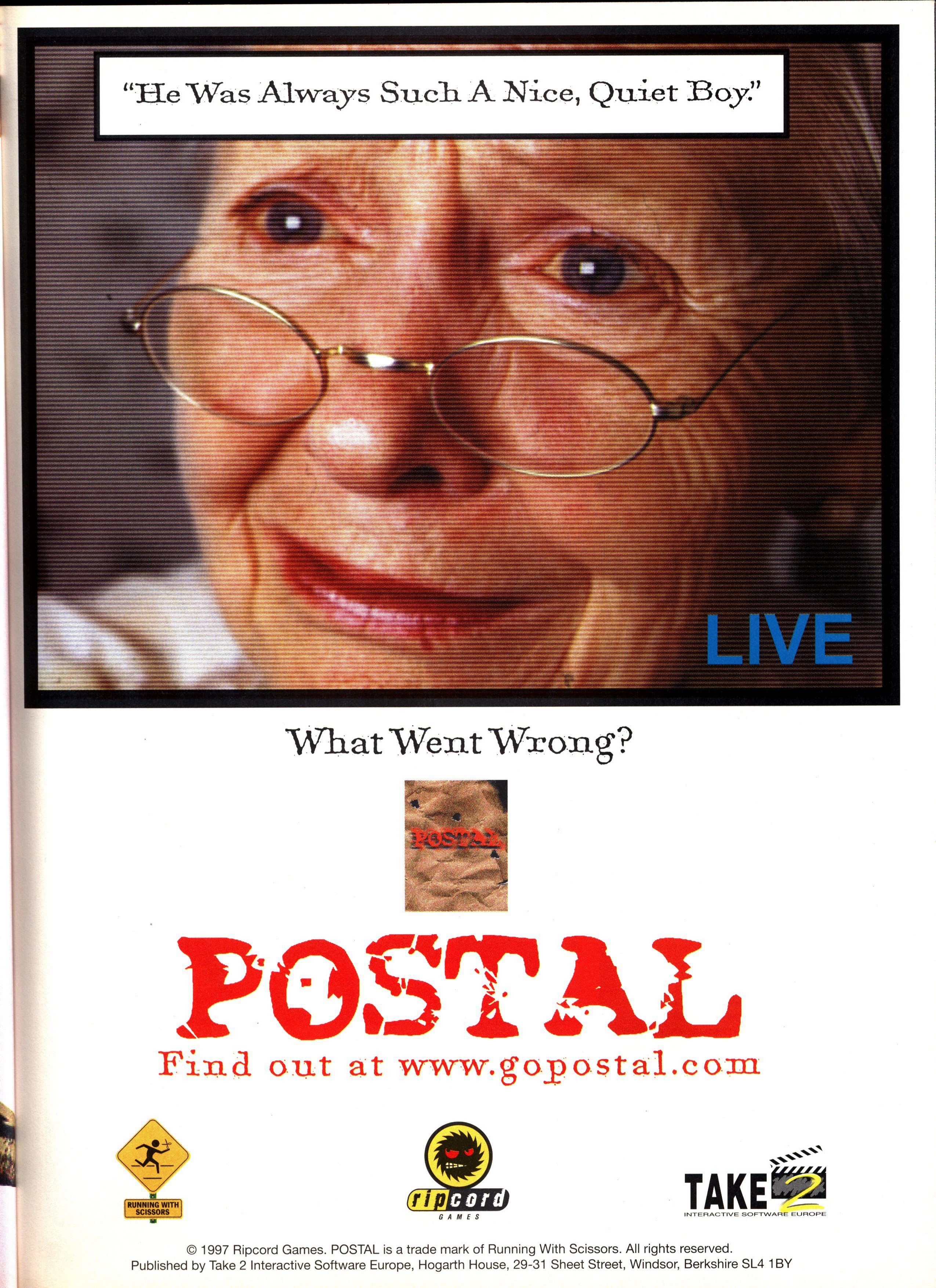 Postal - классический шутер, полный черного юмора и лютых приколов, выпущенный компанией Running with Scissors и Ripcord Games в 1997 году. Из-за насилия игра была запрещена во многих странах. Переиздание произошло в марте 2001 года, получившее название Postal+, включало в себя дополнение «Специальная доставка». 20 мая 2016 года для Microsoft Windows было выпущено переиздание игры Postal Redux.