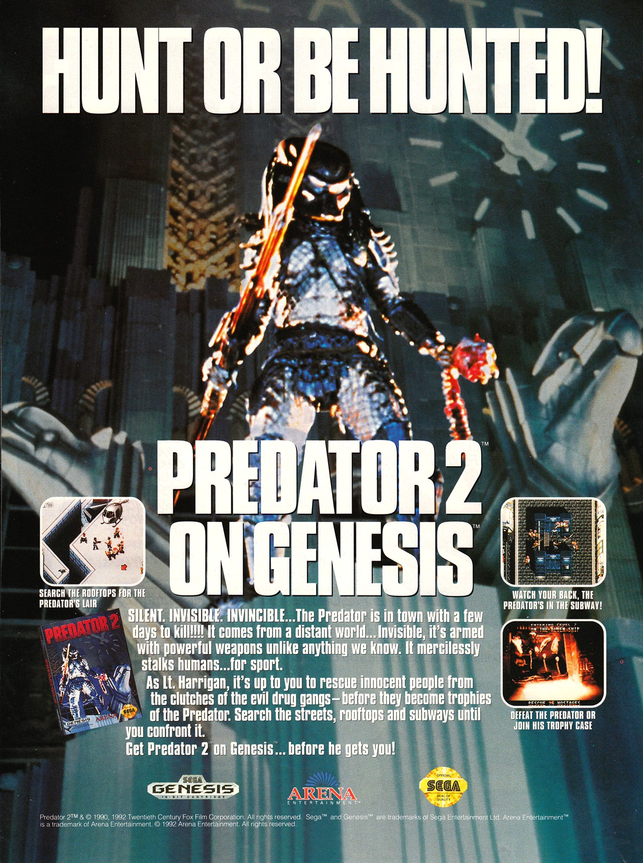 Predator 2 is a sort of Ikari Warriors or Guerilla War with a science fiction theme. The graphics and sound don't really show off the Genesis' capabilities. Although, nice digitized movie images appear between levels. Challenge-wise, the game is adjustable. However, advanced gamers won't break a sweat even on the hardest setting -- especially with the password feature. Predator 2 definitely the Arena's two alien titles but run ‘n' gun fans just might want to hunt it down.