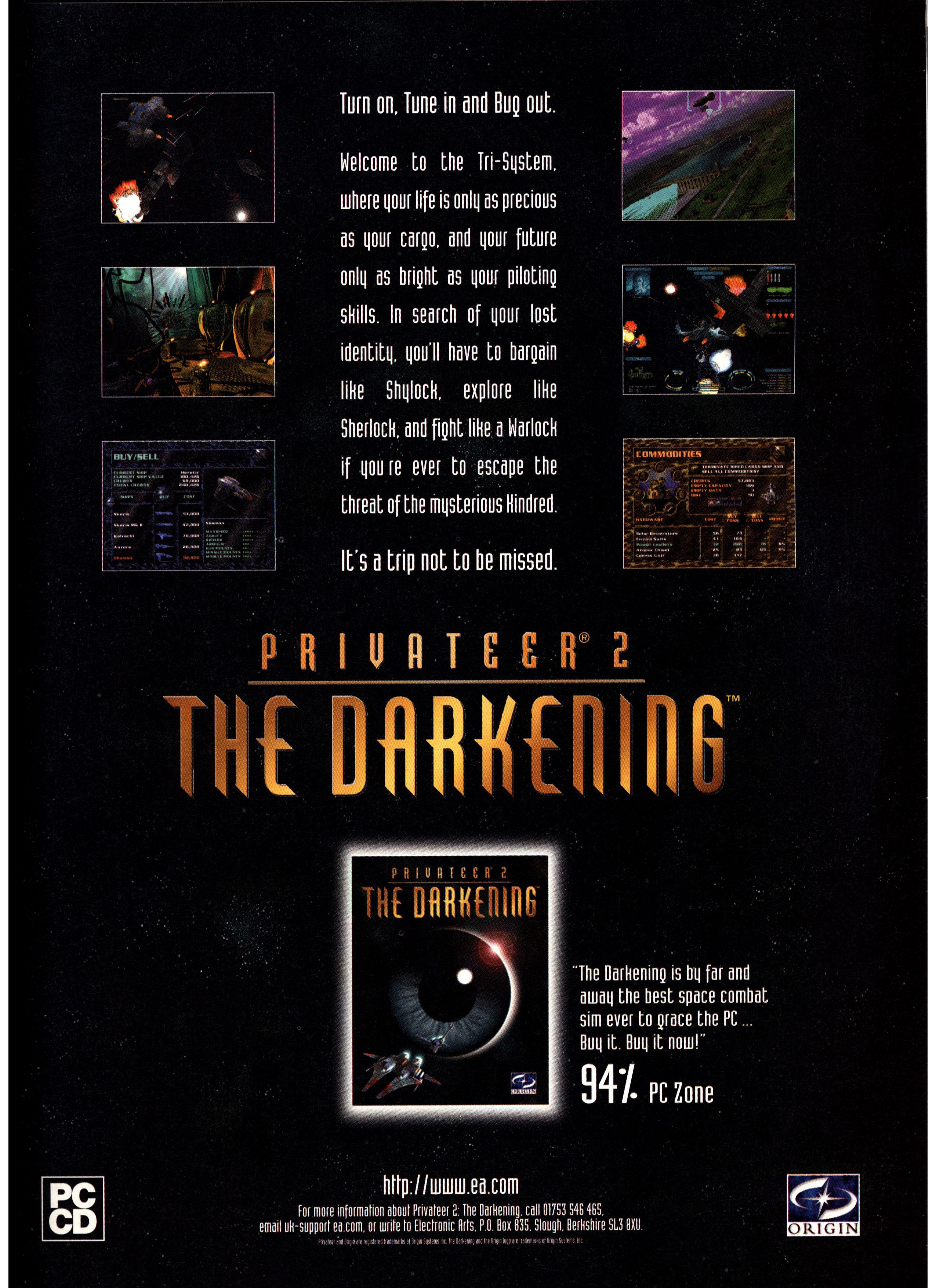 The gaming world was taken by storm in 1993 with Privateer, a game that combined the intergalactic shoot-'em-up with the strategic trader/smuggler, all based in the ever-popular Wing Commander universe. It was non-linear and original, and more fun than a barrel of floppy disks. It carved an indelible place into many gamers' hearts, and it was obvious that Origin would give us more of what we wanted. _Privateer 2- (originally titled simply The Darkening) is just that, with enough of the old to get us excited, and with enough original features to make it worth the money.