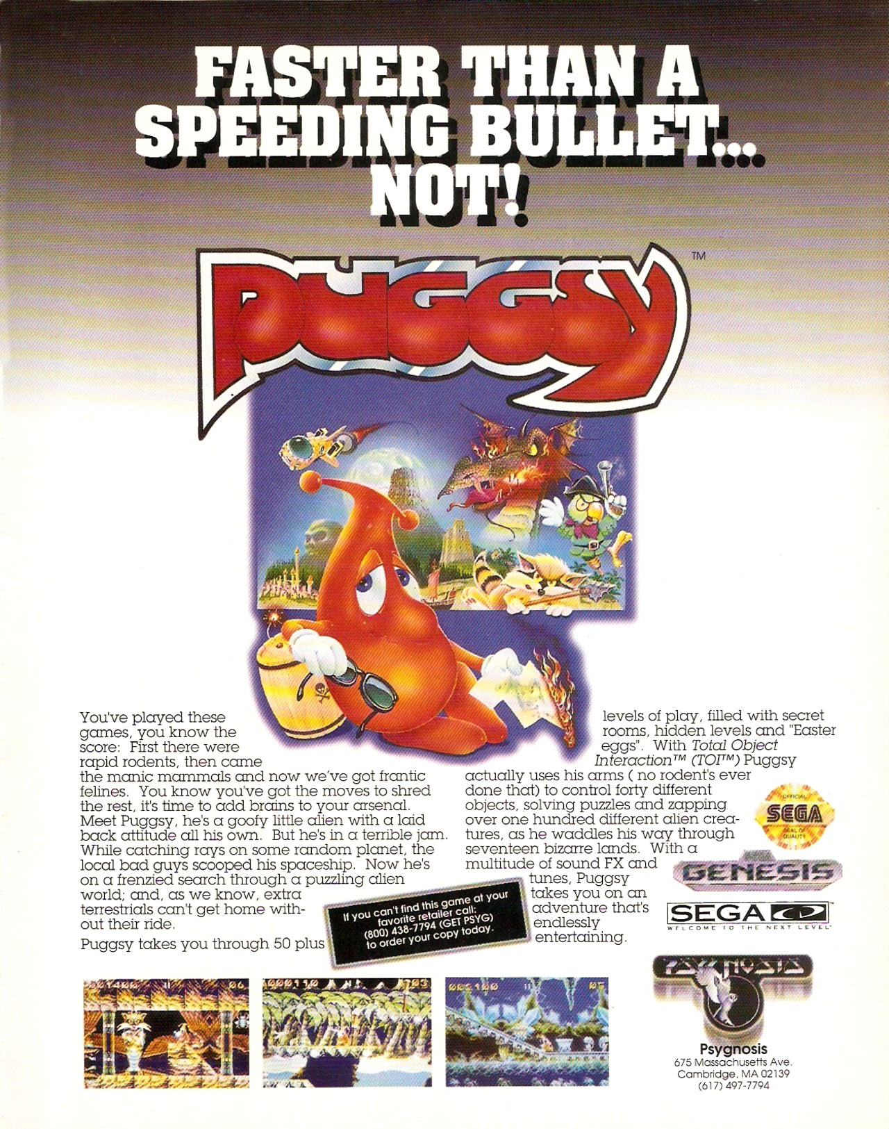 You've played these games, you know the score: First there were rapid rodents, and then came the manic mammals and now we've got frantic felines. You know you've got the moves to shred the rest, it's time to add brains to your arsenal. Meet Puggsy, he's a goofy little alien with a laid back attitude. But he's in a terrible jam. While catching rays on some random planet, the local bad guys scooped his space-ship. Now he's on a frenzied search through a puzzling alien world; and, as we know, extra terrestrials can't get home without their ride.