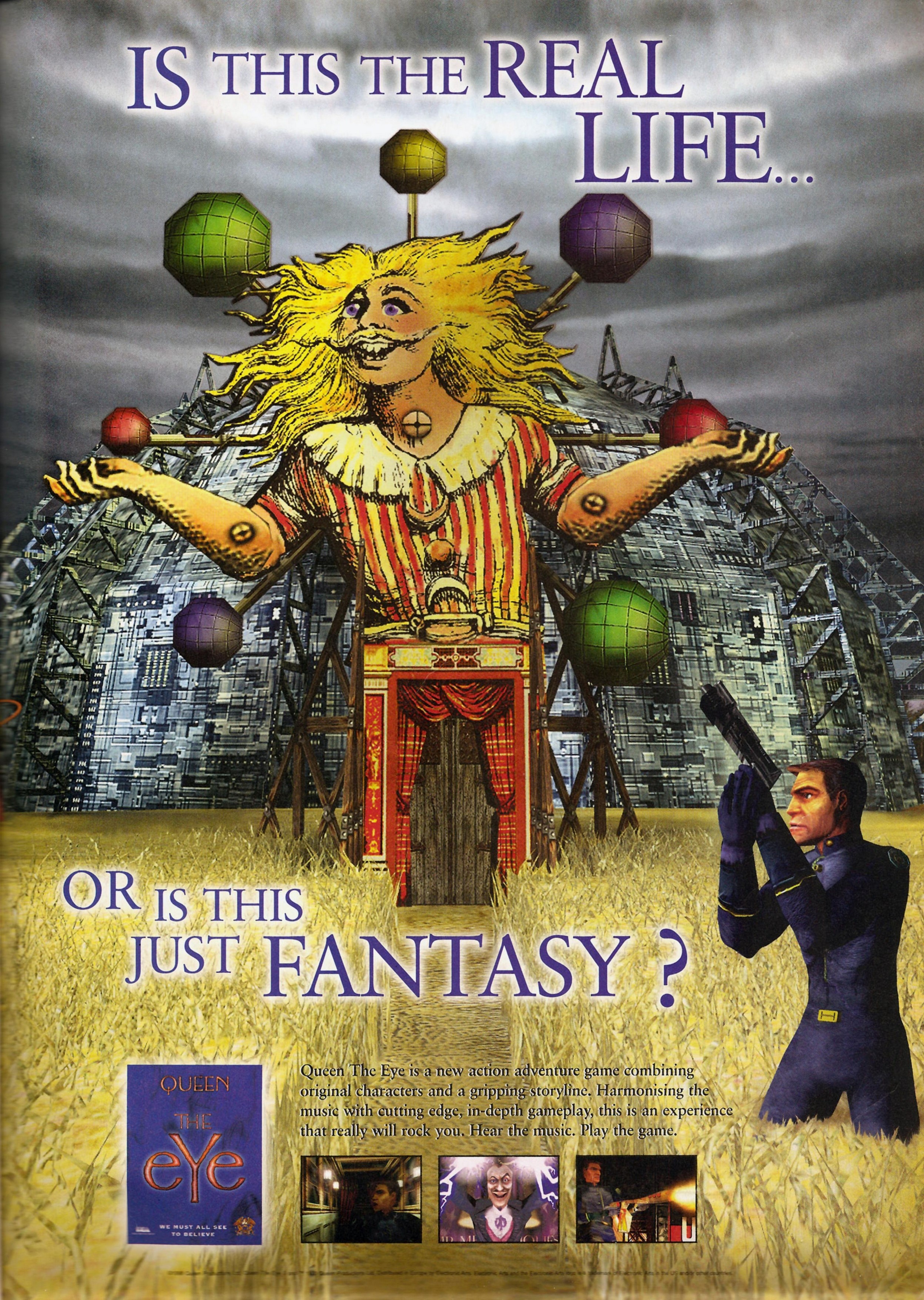 Queen: The Eye has allegedly been inspired by the work of Queen, and features music tracks taken from all eras of the band's career. Curiously, rather than being a game featuring Bicycle Races, Fat-Bottomed Girls, and clog-wearing ponces with giant haircuts, it's an Ecstatical Resident Evil-style polygon beat 'em up-cum-puzzle-type game. And, of course, just to distance things further from the music and lyrics of Queen, it' set in a dark, decaying future where the economic collapse of society has left the world controlled by an insane, self-replicating bio-organic computer called The Eye.