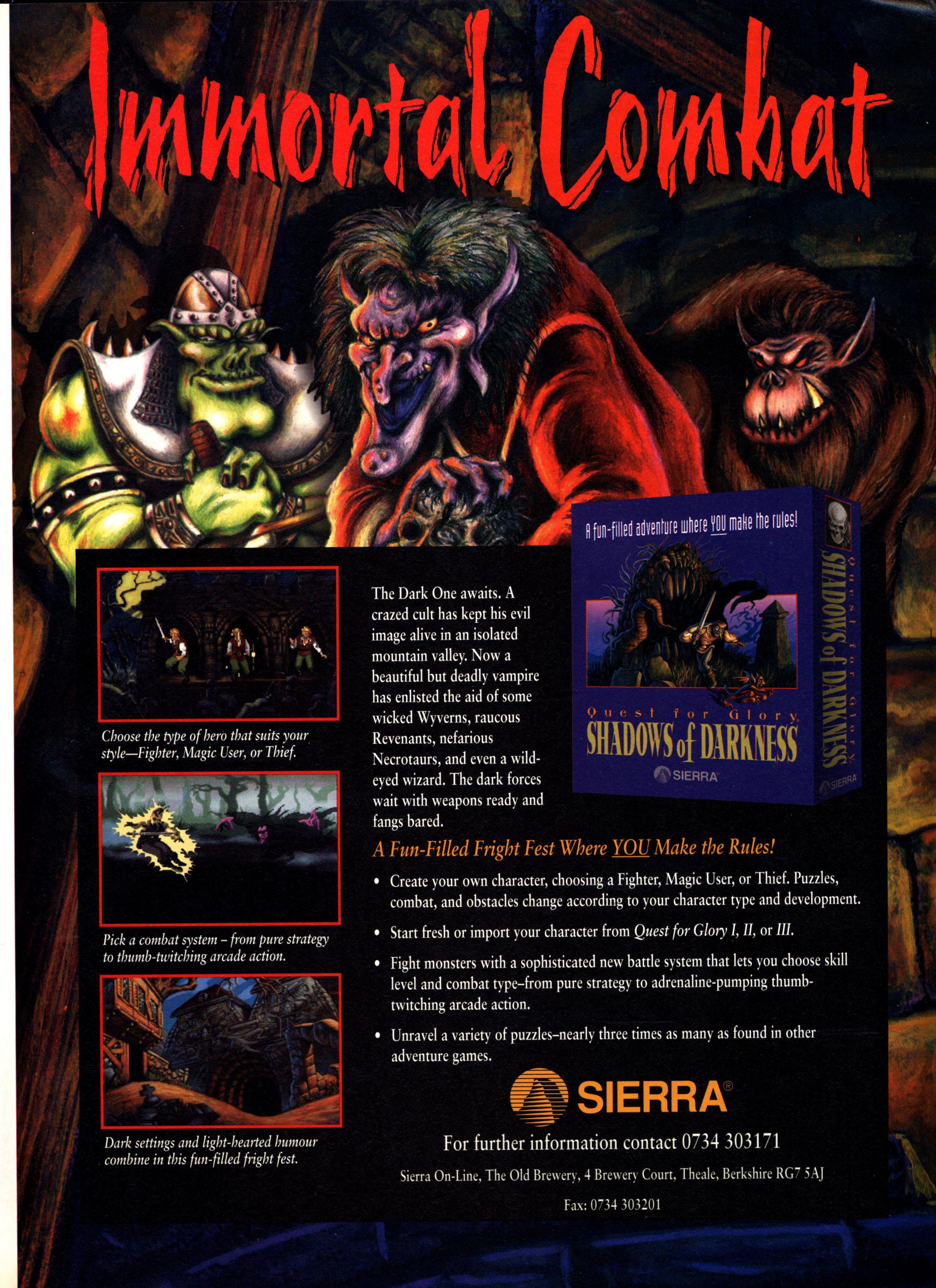 I have never been particularly enamoured with Sierra adventure games. Most of the ones I have played forced me to revert to trial and error investigation to find the solutions to illogical puzzles. In this respect, Shadows Of Darkness is a vast improvement. The clues to the puzzles can be found by conversing with the villagers and investigating the buildings in the town. Even when you're stuck in one place, there's always something else to be getting on with while you think about it. The only weak links are the rather throwaway combat scenes which provide a welcome diversion to start with, but just get in the way the deeper you get into the plot. That aside, Shadows Of Darkness is a well written, engrossing adventure and should keep most people guessing for a week or two.