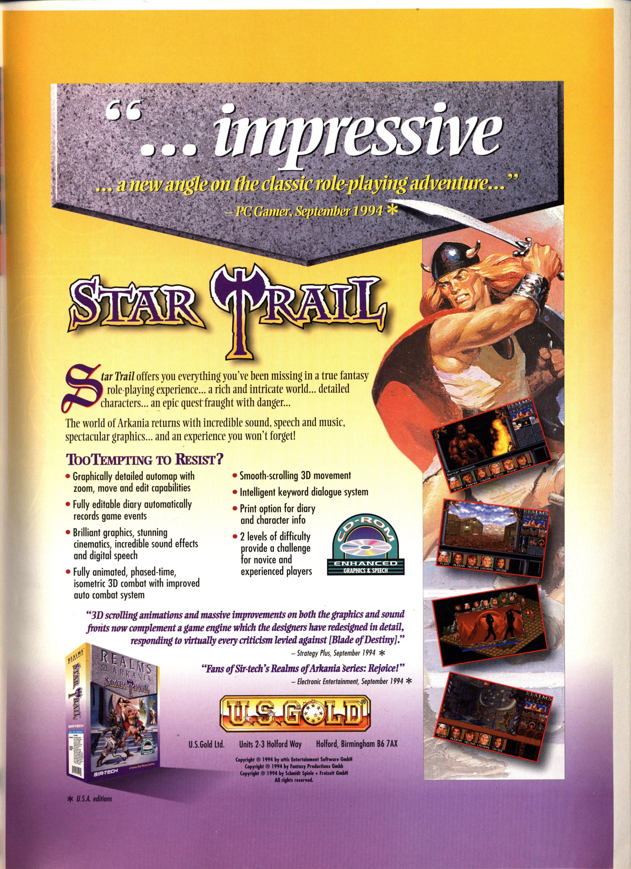 Realms Of Arkania was a stunning piece of work when it appeared in September 1993. Massive and complex, it kept our then resident RPGer busy, or at least quiet, for a month. Obviously it kept its programmers quiet for a while too because the sequel, Star Trail, has just appeared. It's reassuringly like the original, but there have been some major improvements under the surface. The dialogue system is better, with a nice keyword approach. The fighting is better and so is the travelling. Oh, and with the CD version we now have characters who talk, belch and go "Uuuurgh!".