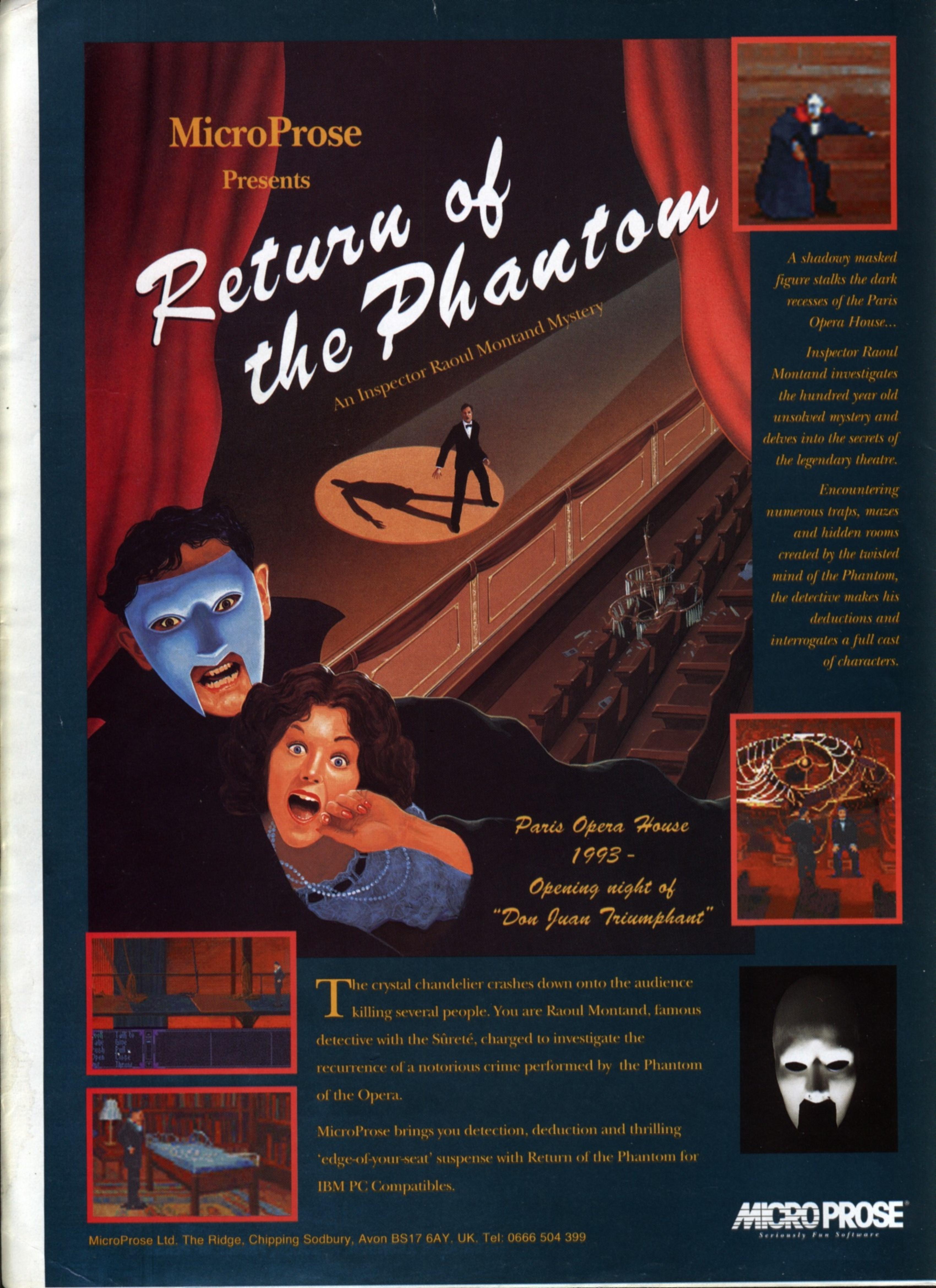MicroProse have already had one foray into the world of mystery with The Legacy. Now they're at it again with Return Of The Phantom. Not that Phantom should in anyway be connected with The Legacy, in game style it's much closer to Rex Nebular. The game starts out in the present day in the Paris Opera during the premiere of Don Juan Triumphant, the opera that had been written by the Phantom himself a century before. Unfortunately. Opera lovers' enjoyment of the evening's performance is somewhat reduced by a large chandelier falling on their heads. This sort of thing is not good for publicity - though it does wonders for a hang over - but. fortunately for the management, that starleading light of the Surete. Inspector Raoul Montaud. happens to be present. Isn't it lucky that, whenever there's some catastrophe, a leading detective just happens to be around? Bit of a bind for them though. I guess.