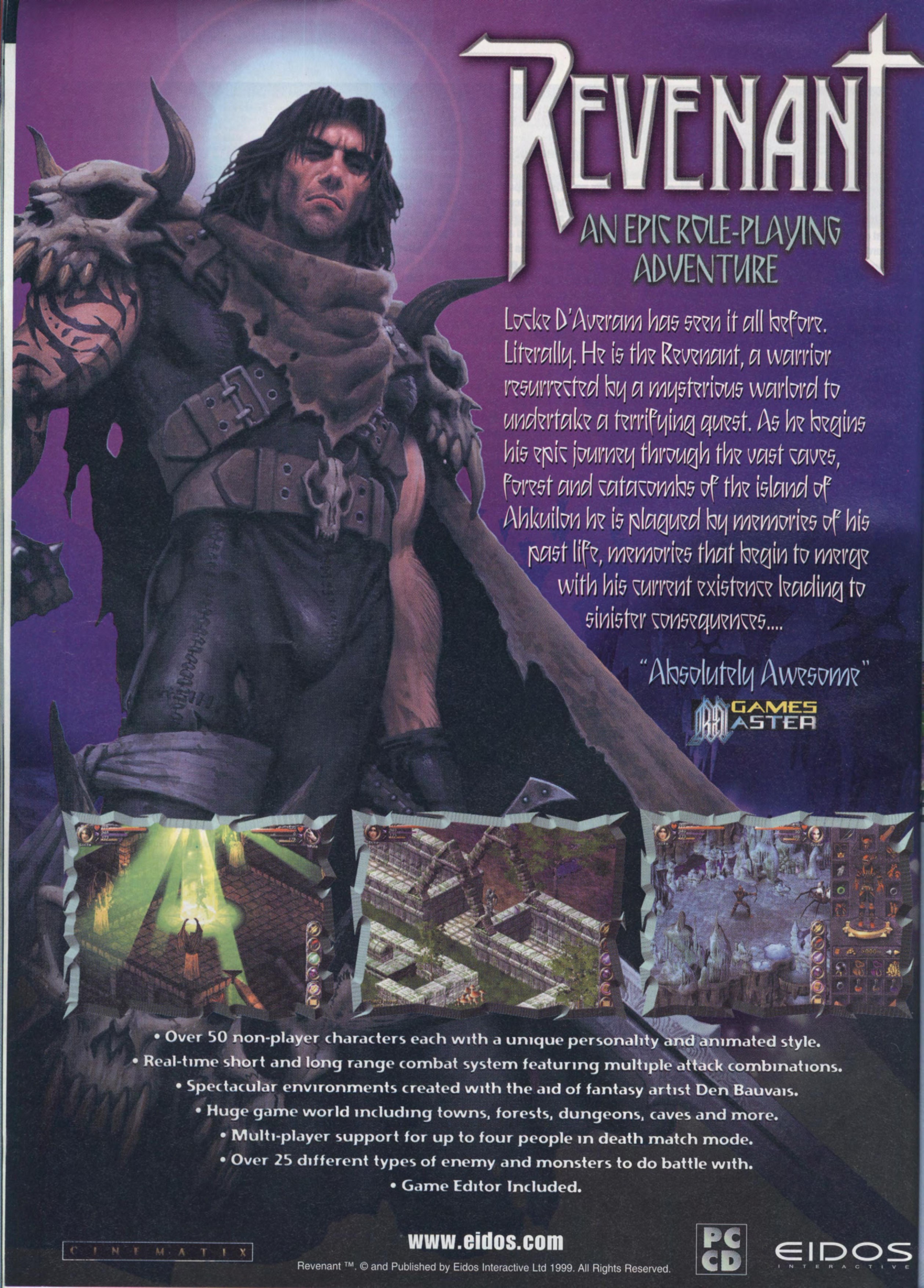 Graphically, Revenant is very refined. The isometric graphics are excellently drawn, and the interface is familiar and easy to get the hang of. The combat is real-time and draws more from the influence of famous beat 'em ups than from hard-core dice-rolling systems. The only stumbling block is Revenanfs storyline, which is trite and clich6d. Burnt out, ageing purists will scoff at the cheesy dialogue and dodgy voice acting, but those with thicker skin will stick at it and enjoy what is otherwise a highly competent role-playing game. Revenant is not going to change the world but those of you who like your 'cheese' will enjoy it.