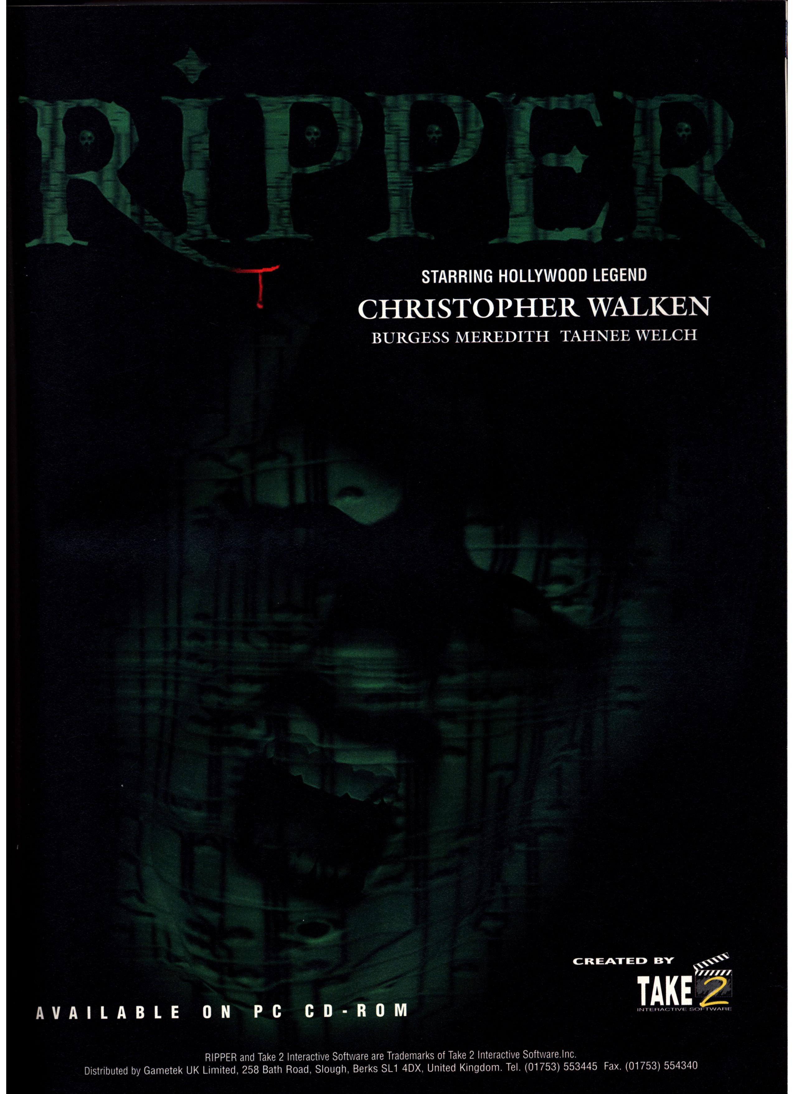 Ripper - это интерактивная приключенческая игра 1996 года. В создании игры принимали участие настоящие знаменитости, такие актеры как Кристофер Уокен, Пол Джаматти, Карен Аллен, Берджесс Мередит. Поиграем в страшное кино вместе с прогрессивным маньяком Потрошителем?