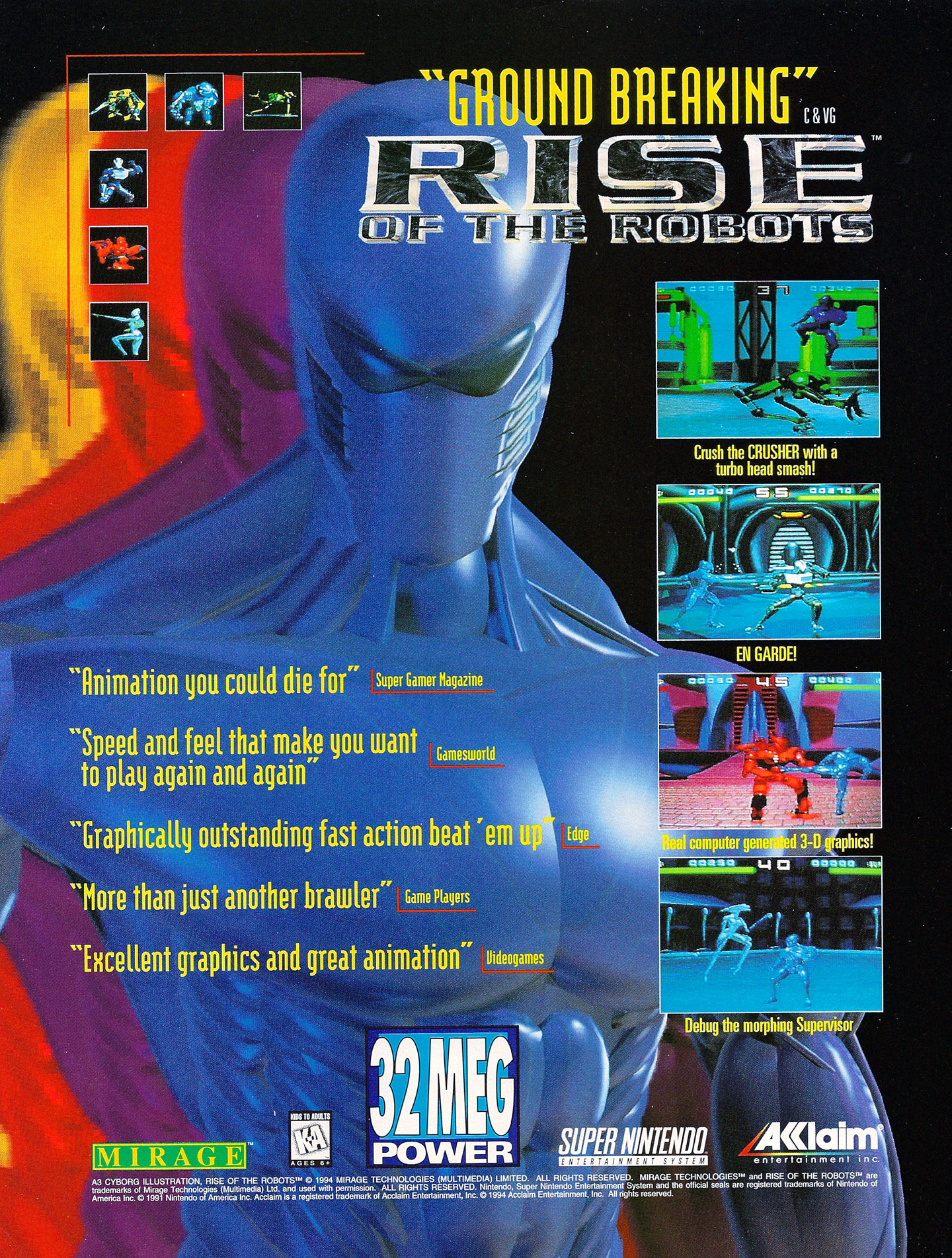 Rise of the Robots is noted as one of the least successful and most critically maligned fighters of all time, that was developed by Mirage Media and released by Time Warner Interactive in 1994 and ported to numerous other game systems. Despite featuring incredible graphics for the time, it suffered from myriad crippling gameplay problems.
