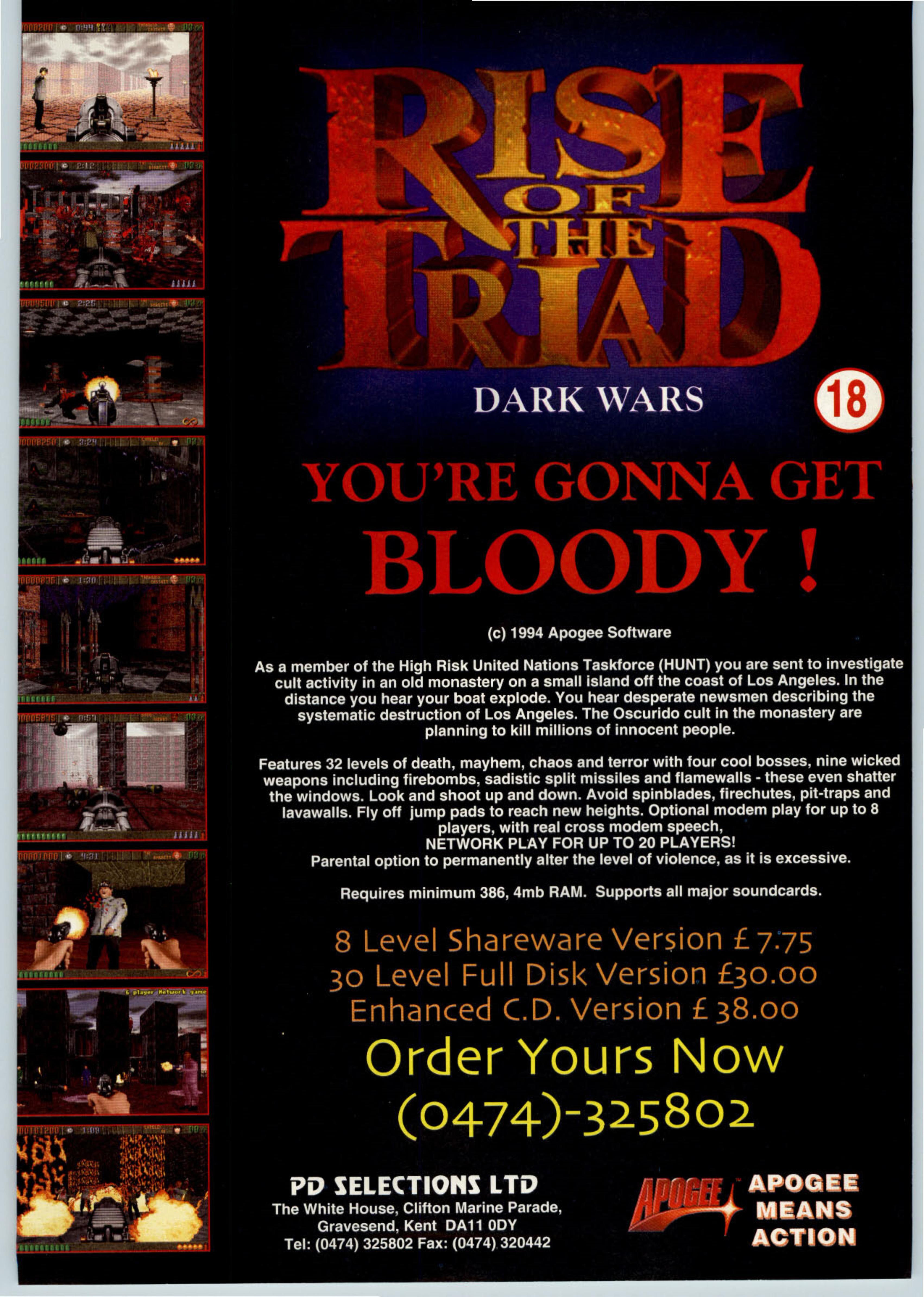 This is Apogee's entry into the Doom stakes. Again, the plot doesn't really matter; the object is to stay alive. The first thing in the game is to choose the level of violence. This ranges from none through some, a lor and excessive. Excessive is good. When you shoot the baddies, eyeballs fly off. But exactly what the baddies are supposed to be is confusing. They look like officers form the First World War. They wear greatcoats and stand sideways on to fire - like in a duel. One of the strengths of Rise of the Triads is the way it uses different levels of the game arena. There's a lot of running up free-standing staircases and a bizarre number of trampolines. Finding the exits is a real pain. I can't remember a game like it. There's lots of hidden areas concealing food and weapons.