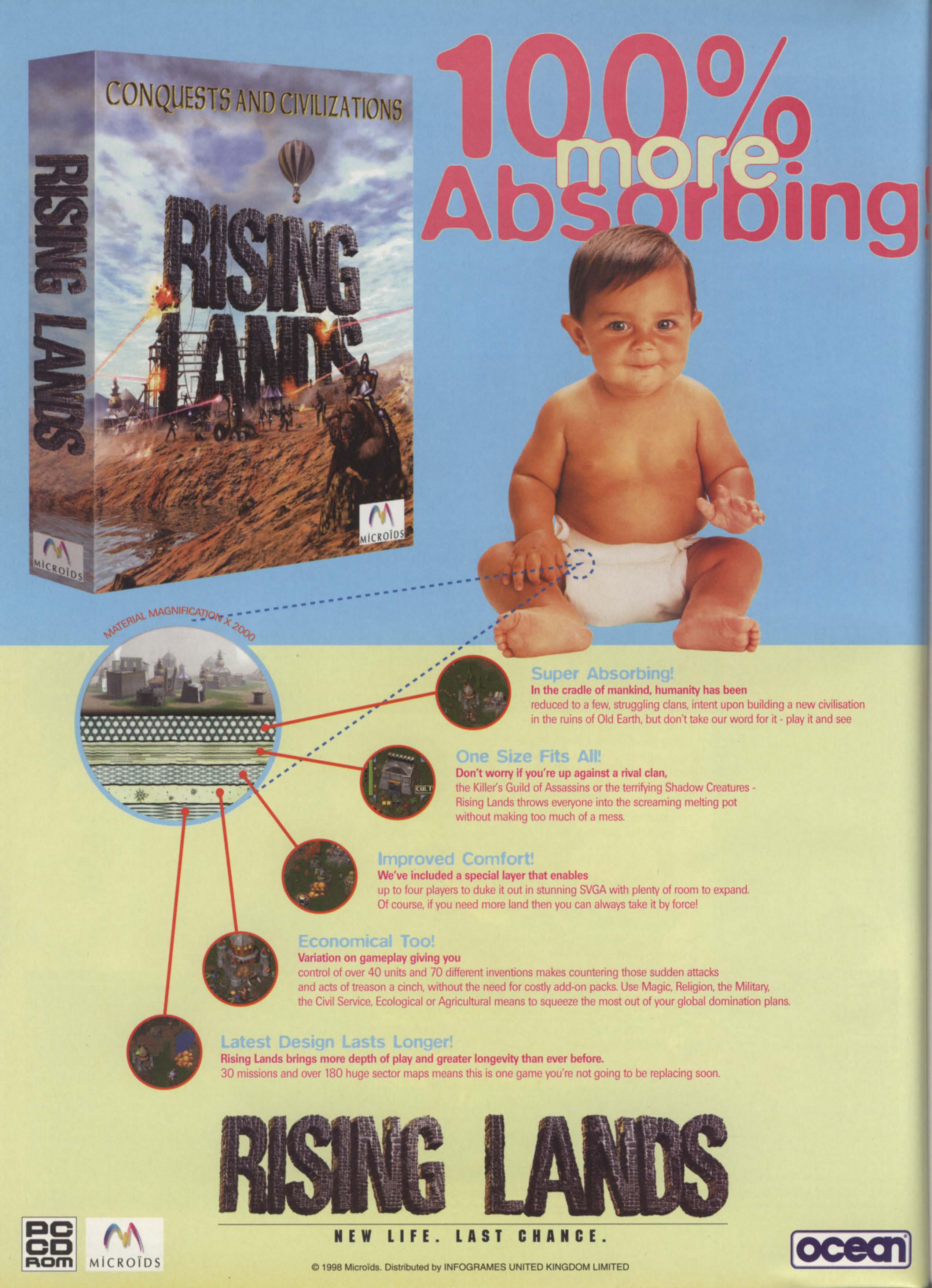 Graphically it's nothing to write home about, but there's a ridiculous amount of stuff to research in the game, a huge variety of units, and all sorts of buildings can be built throughout the game that affect the gameplay and so ensure longevity to some extent. Unfortunately, if you have played StarCraft or Total Annilation, this game is going to be a massive, multi-storeyed disappointment. It doesn't have the style and panache of StarCraft, or the stupidly addictive playability of Total Annihilation, but it's so easy to get to grips with that newcomers to real-time strategy games will probably find Rising Landsan enjoyable introduction to the genre.