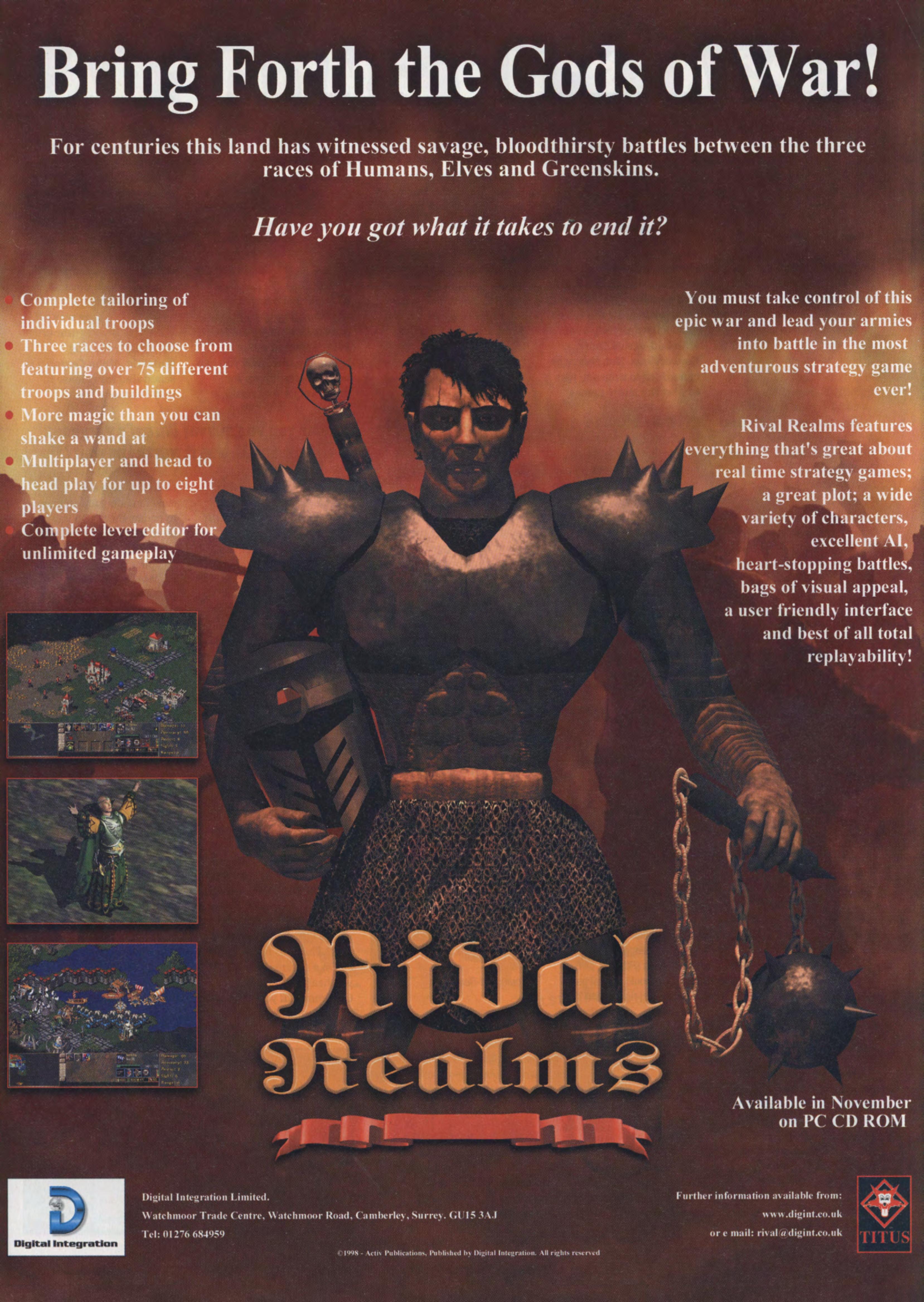Fourteen different units including archers, soldiers, warships and flying machines make up your species' ranks, and each unit can improve their strength, accuracy and armour ratings by killing armies and mythical creatures encountered on the way. Any characters still alive at the end of a mission can even be saved and used later. Aside from the rather unimaginative graphics and schizophrenic Al, everything else in Rival Realms seems to be in place. The interface is crisp, units can be selected as individuals or groups, and the SimCity-style building/resource section is straightforward, if a little simplistic. Hardly vintage gaming, but it might keep you going for a few nights.