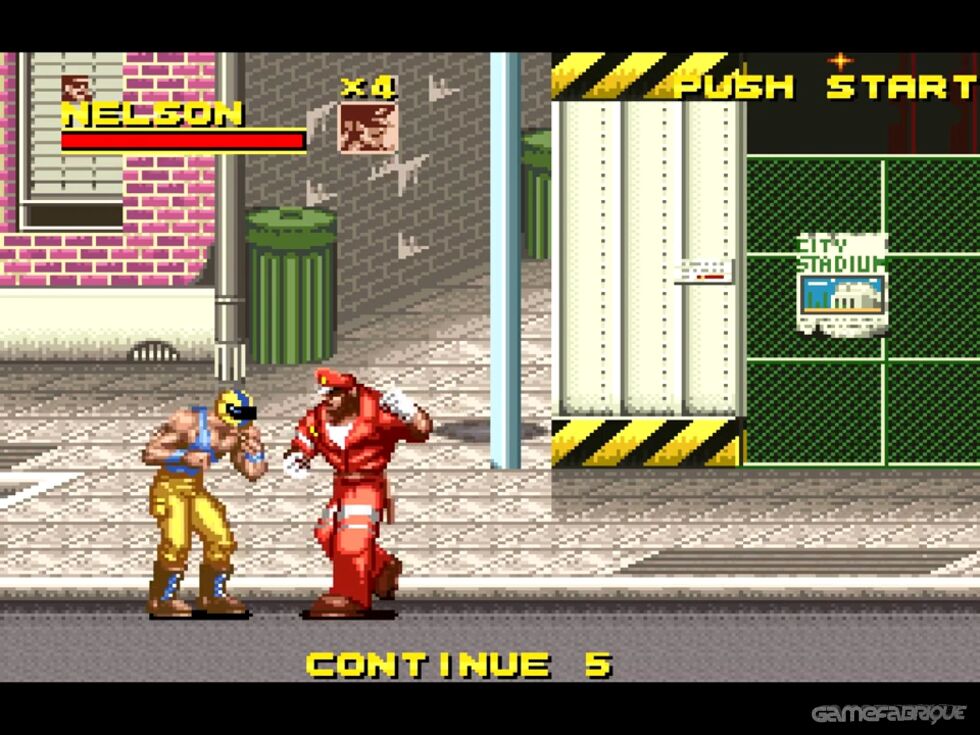 You can hit L or R to speed up your character, too. Pick up knives, bricks, rocks, or dynamite and toss 'em. The optional Angry Mode makes you temporarily invincible if you take a beating.