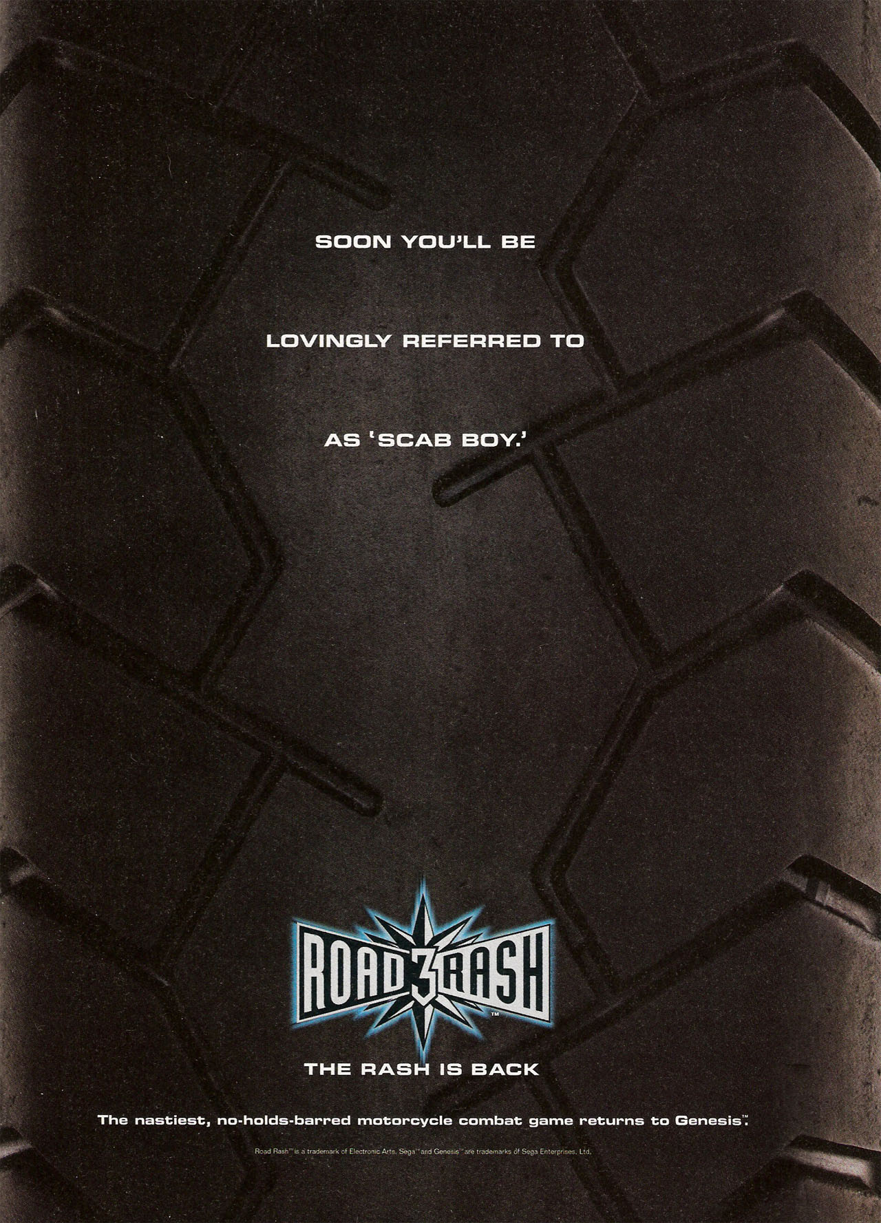 Electronic Arts for Genesis EA wasn't at the show, but it held a little party at Planet Hollywood so we could see some of its '95 releases. Road Rash 3 looks like it could be the best 16-bit motorcycle game to date, with more weapons, more tracks, and more fun. However good Road Rash 3 ends up being, it's always gonna pale in comparison to the 300 Road Rash that totally rocks. Still, for 16-bit hit and race action, Road Rash 3 could be your ticket.