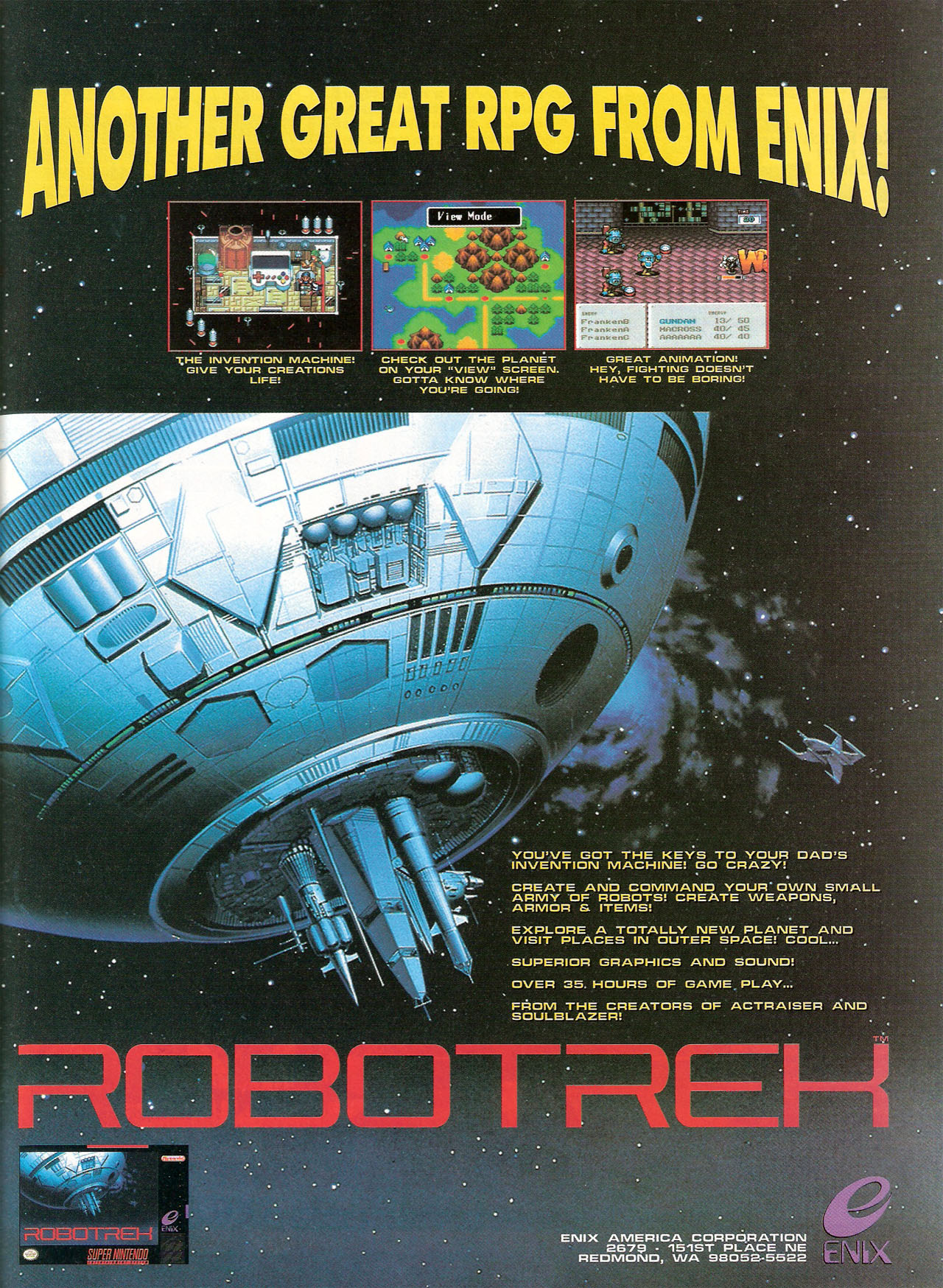 RPG fans have long been pining for games that deviate from the standard set by the ever-popular SNES pillar, Final Fantasy II. Remember the saying: Be careful what you wish for, you may just get it! Enix has been a formidable force in the RPG world, and it's tossed its sword into the ring once again with Robo Trek, a game that unsuccessfully attempts to push the envelope of its genre.