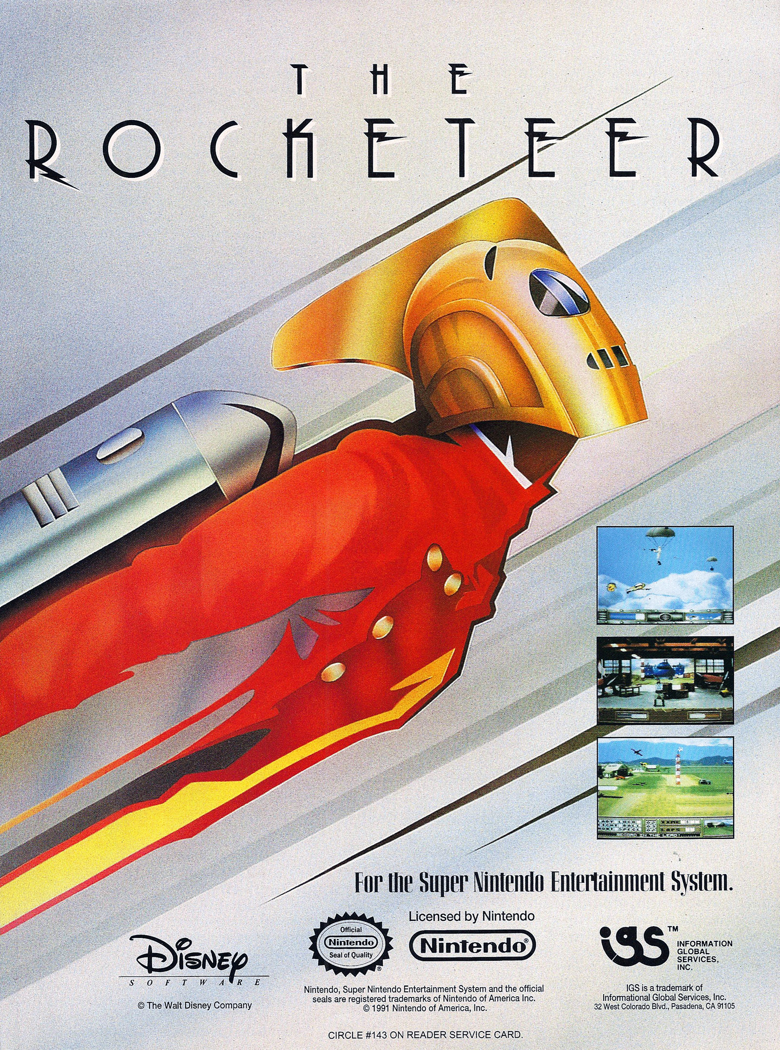 The Rocketeer is flying its way into your home for the Super NES! IGS has spared no expense in making The Rocketeer look and feel as exciting as the movie it is based on! You control Cliff on a mission to stop a terrorist organization from stealing the rocketpack! But to top it off, the terrorists have also kidnapped Jennifer! You must rescue Jennifer and put a stop to these terrorists! The Rocketeer will arrive in May!