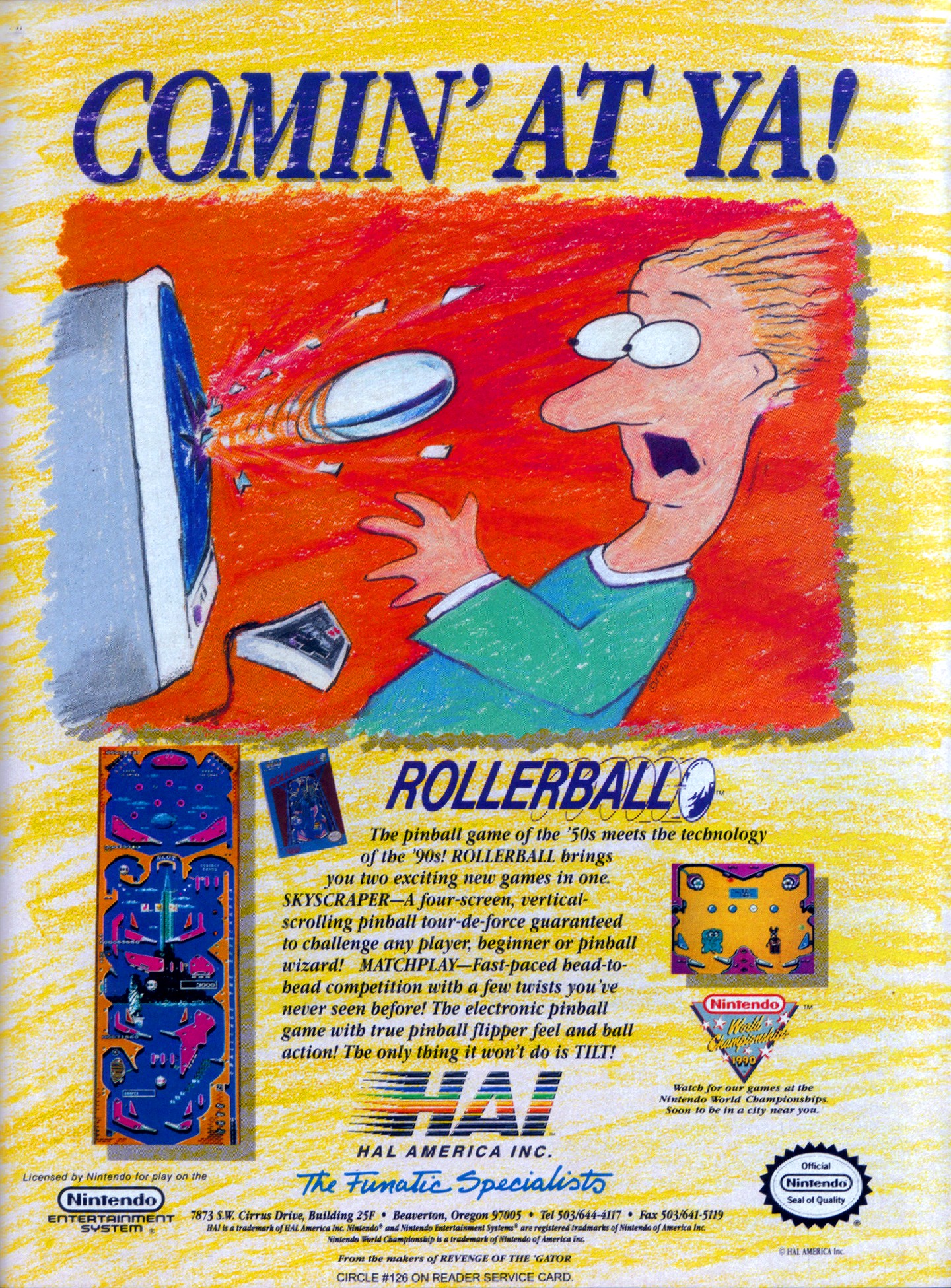 Hal America brings pinball to NES with Rollerball, and to Game Boy with Revenge of the 'Gator. Multi-screen, vertical scrolling pinball guaranteed to challenge any player, beginner or pinball wizard. The most life-like movement and game play of any video pinball game. One famous magazine says "Revenge of the 'Gator's snazzy little reptiles show off Game Boy at its best".