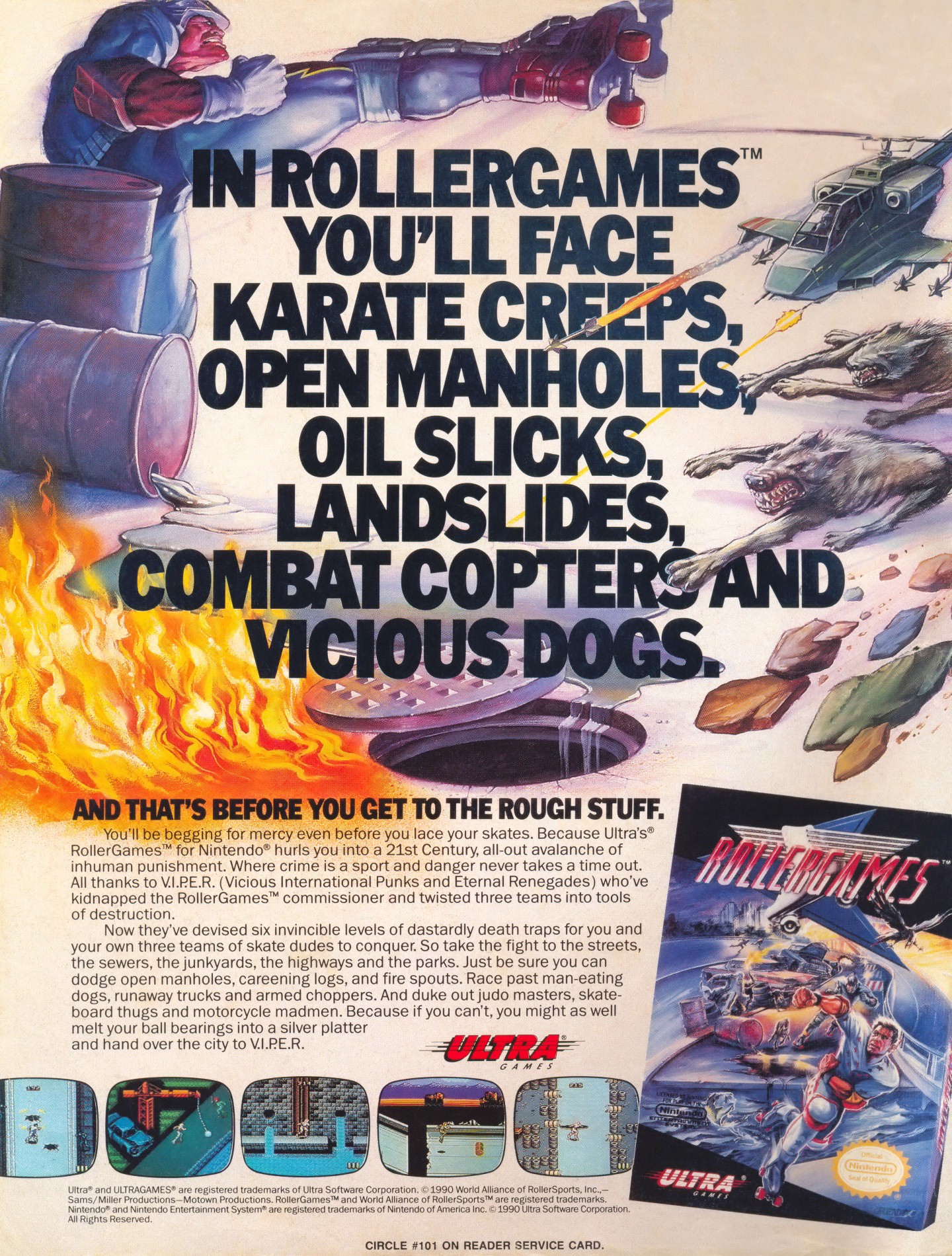 You'll be begging for mercy even before you lace your skates. Because Ultra's RollerGames for Nintendo hurls you into a 21st Century, all-out avalanche of inhuman punishment. Where crime is a sport and danger never takes a time out. All thanks to V.I.RE.R. (Vicious International Punks and Eternal Renegades) who've kidnapped the RollerGames commissioner and twisted three teams into tools of destruction.