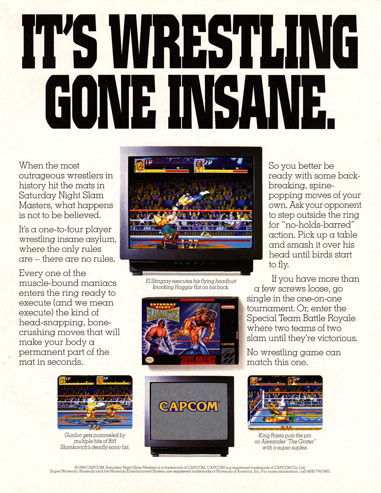 If it's hard for you to take wrestling seriously, take a serious look at Saturday Night Slam Masters! This solid Capcom game rolled through the arcades quickly, but it's a sure-fire bet to establish turf on the SNES.