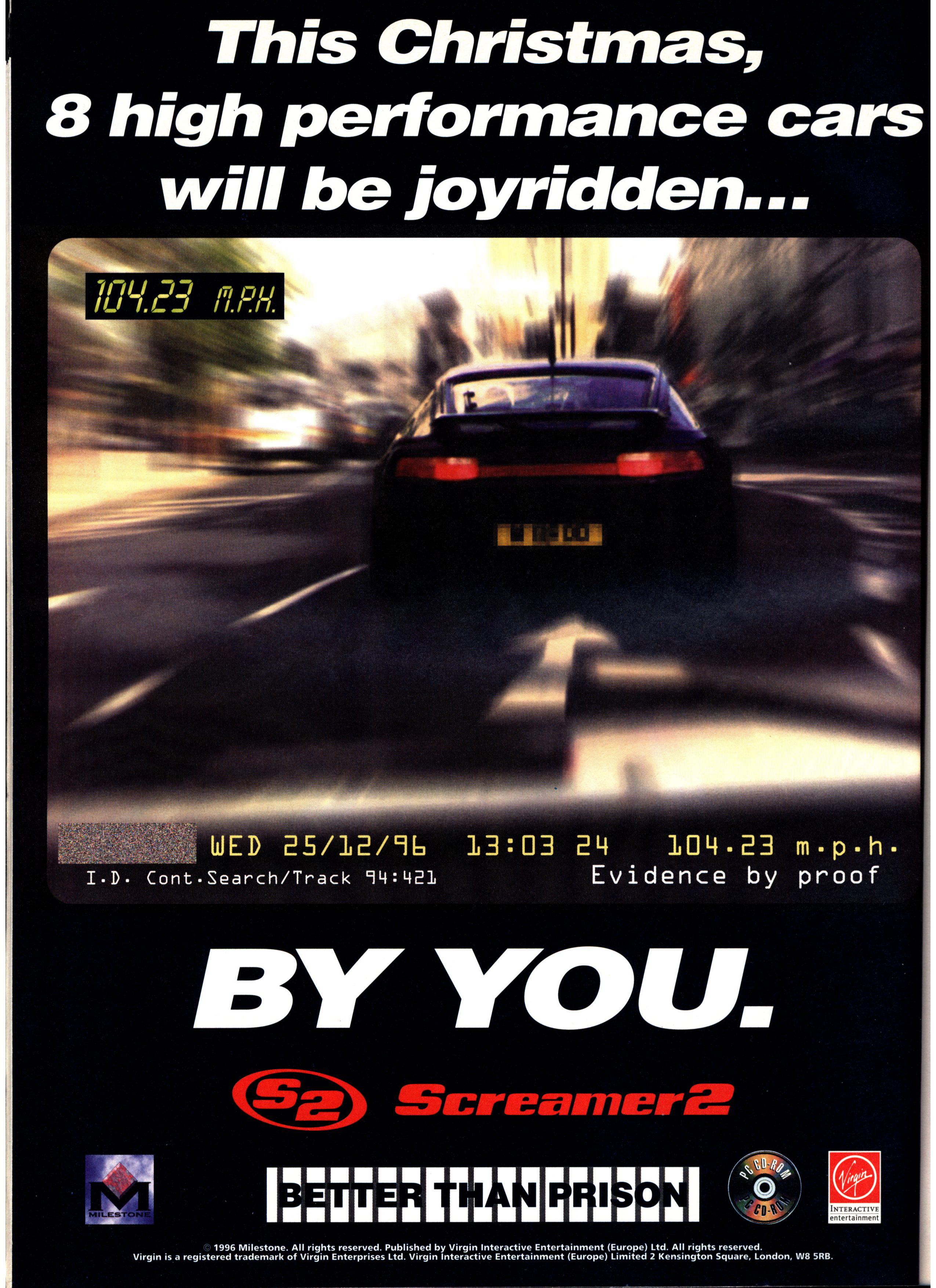 CHAMPIONSHIP: There are four legs. Finish the first three tracks in overall first position (10 points for a win, six for second place etc) and you'll be allowed to progress to leg two, which has an Cadded' track, but harder opposition. Coine overall first in this leg and it's onto the third, which has yet another new track (and yet harder opposition). Finish & this final leg in the required overall first place, and you now have an arcade racing game with six different tracks. But wait! You know how console racing games tend to include hidden Csecrets'? Well, so does Screamer 2. There's a seventh track tucked away in its brain - and a Csecret' car. There may be other joys to discover, but I haven't yet managed to get past the second leg.