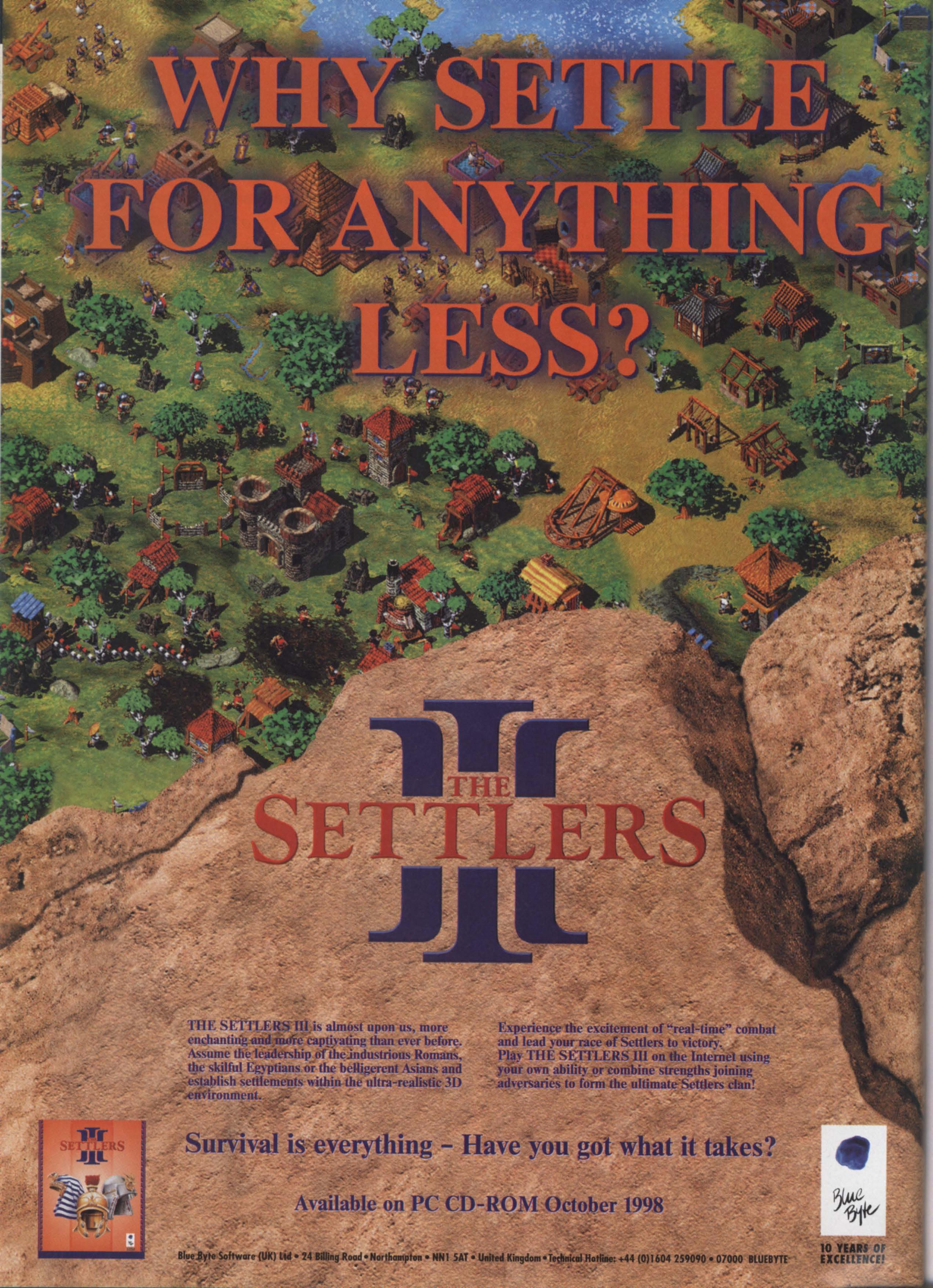 Nothing to do with the popular indigestion treatment - and everything to do with real time strategic simulation in the middle ages - Settlers III is of course the latest instalment of the million-selling series. For newcomers to the wonderful and frightening world of PC games, it's a god sim in which you control the full cycle of your civilisation's evolution, from the initial planning and building of its infrastructure, to the full-blooded conflict of tribe against tribe in the quest to expand your power and domination. A natural progression then, encompassing all facets of human development and naturally leading to bloody conflict. You can't simply take to your neighbours with a blunt stick though, and before starting any warring you'll first need to create a sustainable economy from the interdependent activities of agriculture, industry and trading.