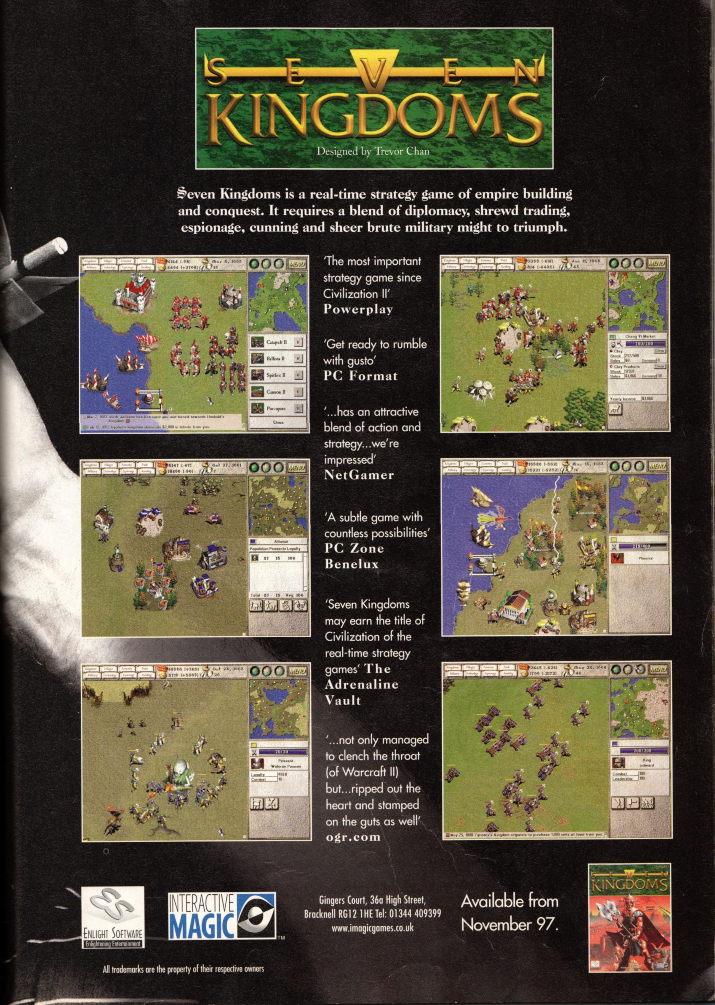Seven Kingdoms is an all-around above average game. It takes several elements from existing formulas such as a real time engine and diplomacy to create a unique and fun gaming environment. It also adds the effects of weather, random attacks, and a random map generator to further enhance gameplay and replay value of this game.