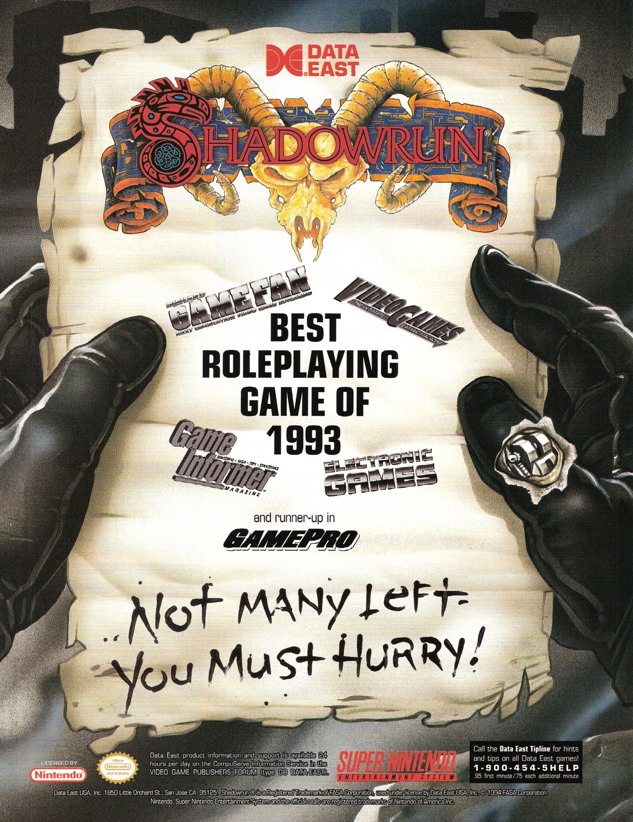 Shadowrun is a really good RPG sporting plenty of items and people to interact with. The quest is long and rough, but it moves slow enough to keep your head on straight. Shadowrun may not be very exciting, but any fan of the board game will be very pleased to pick this one up. The music gets annoying after a while.