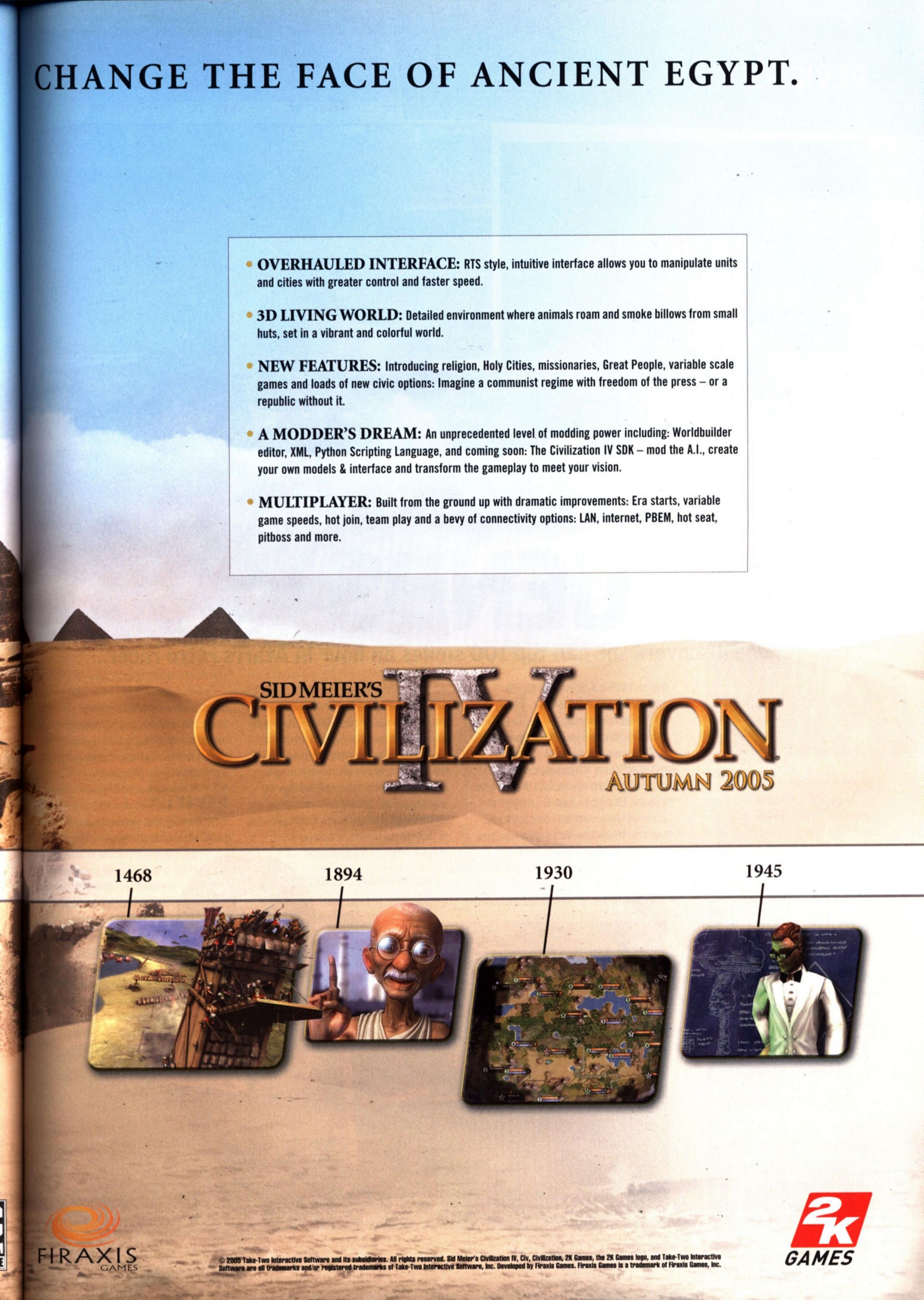 "One Third proven, one third improved, one third new. That's the mantra coming out of the Firaxis office, half an hour's drive from the empty fish restaurants and seedy strip clubs of downtown Baltimore (or an hour if the cabbie is a moron). Situated on an anonymous commercial estate, it's a typical American development studio, with natural light at a premium and salty snacks in ready supply. Not the most glamorous location for the worldwide unveiling of Sid Meier's Civilization IV, but the veteran developer has never really been about show business. In fact, he's not even present at the presentation, preferring to remain out of sight, pulling the strings like the man behind the curtain at the end of The Wizard Of Oz. We do eventually catch up with him, but in the meantime it's down to cold, hard facts.