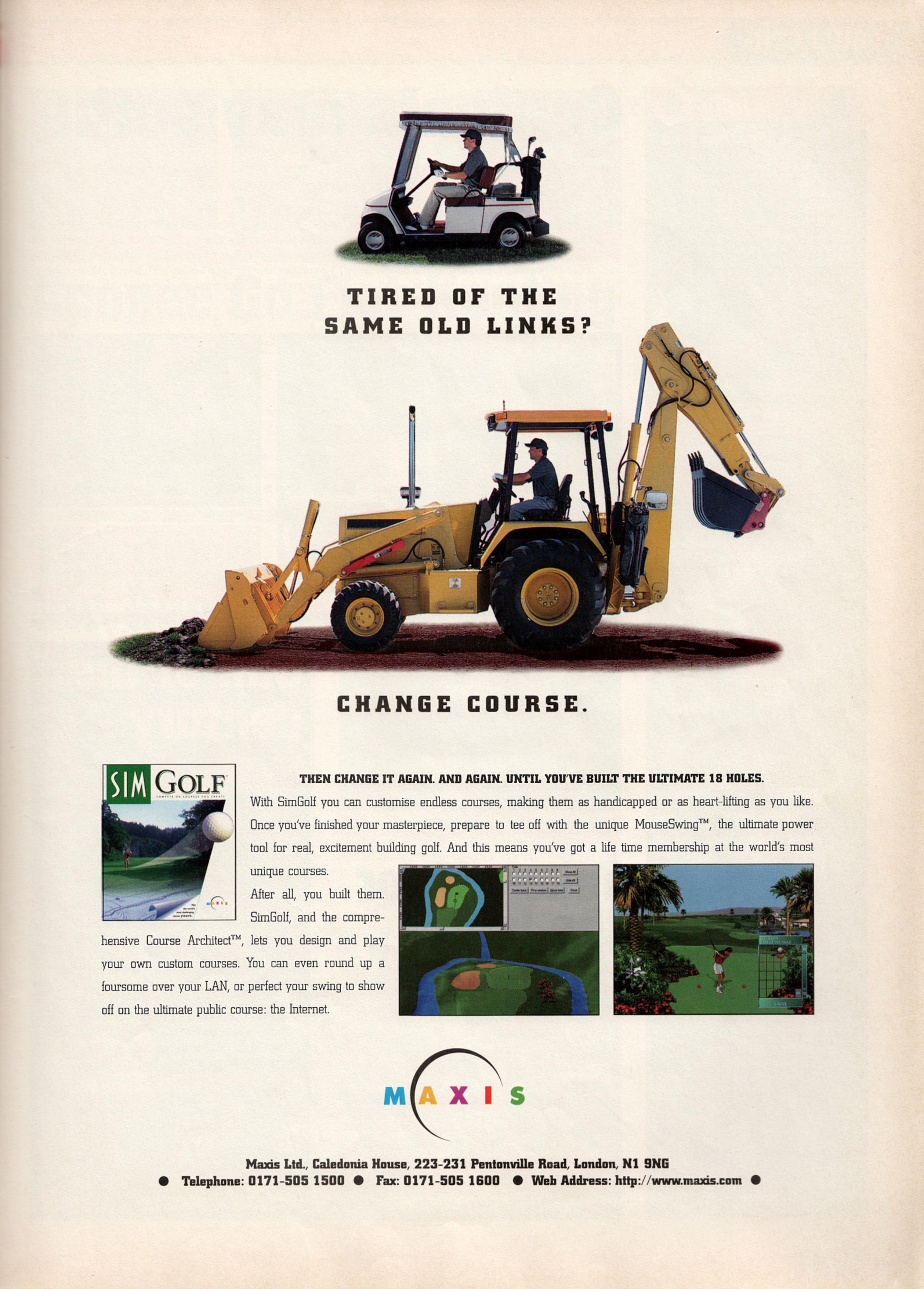 SimGolf is a mixed bag. On the downside, you only get two default courses, there are no computer opponents, the chirping of the birds can be annoying at times, and the grass could have been a little more natural looking. On the upside, you do get to create and then play on your own golf courses (meaning unlimited courses), there is good network support, and overall, even though the grass might look like Astroturf, the graphics are crisp and refreshing. I can't say that SimGolf has the edge with the only course design option because Jack Nicklaus 4 will also have one, but one thing I can say is that Maxis does have an edge with the Swing Indicator. I can't stress how much more interactive it is compared to the PowerBar. In time, you actually feel like you are developing form, something I've found missing in all other golf sims. Out of 100, I give SimGolf a solid 75.