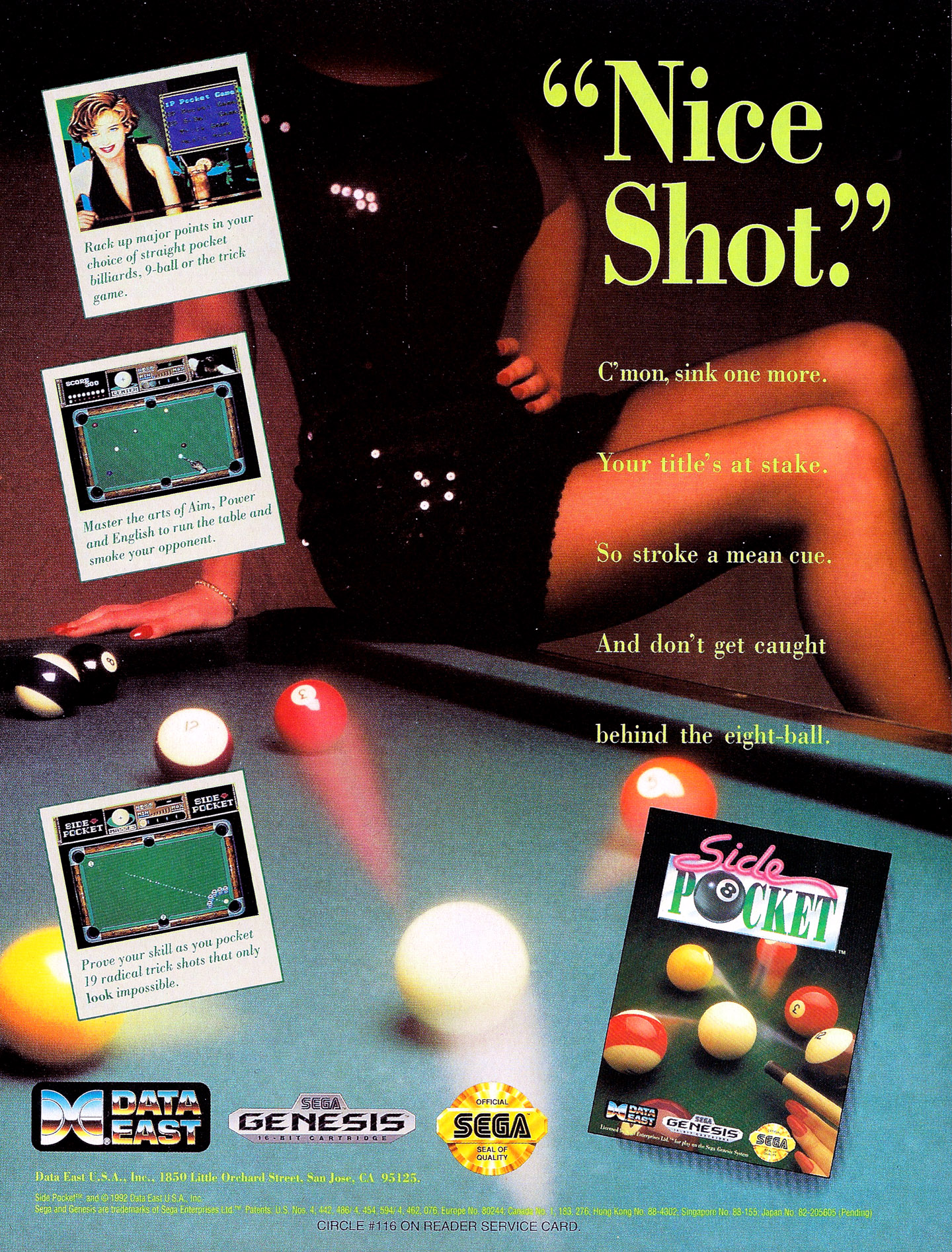 Hey, hustlers, Data East is bringing a smoky billiard room to your Genesis. If you like to shoot pool, cue up for Side Pocket.