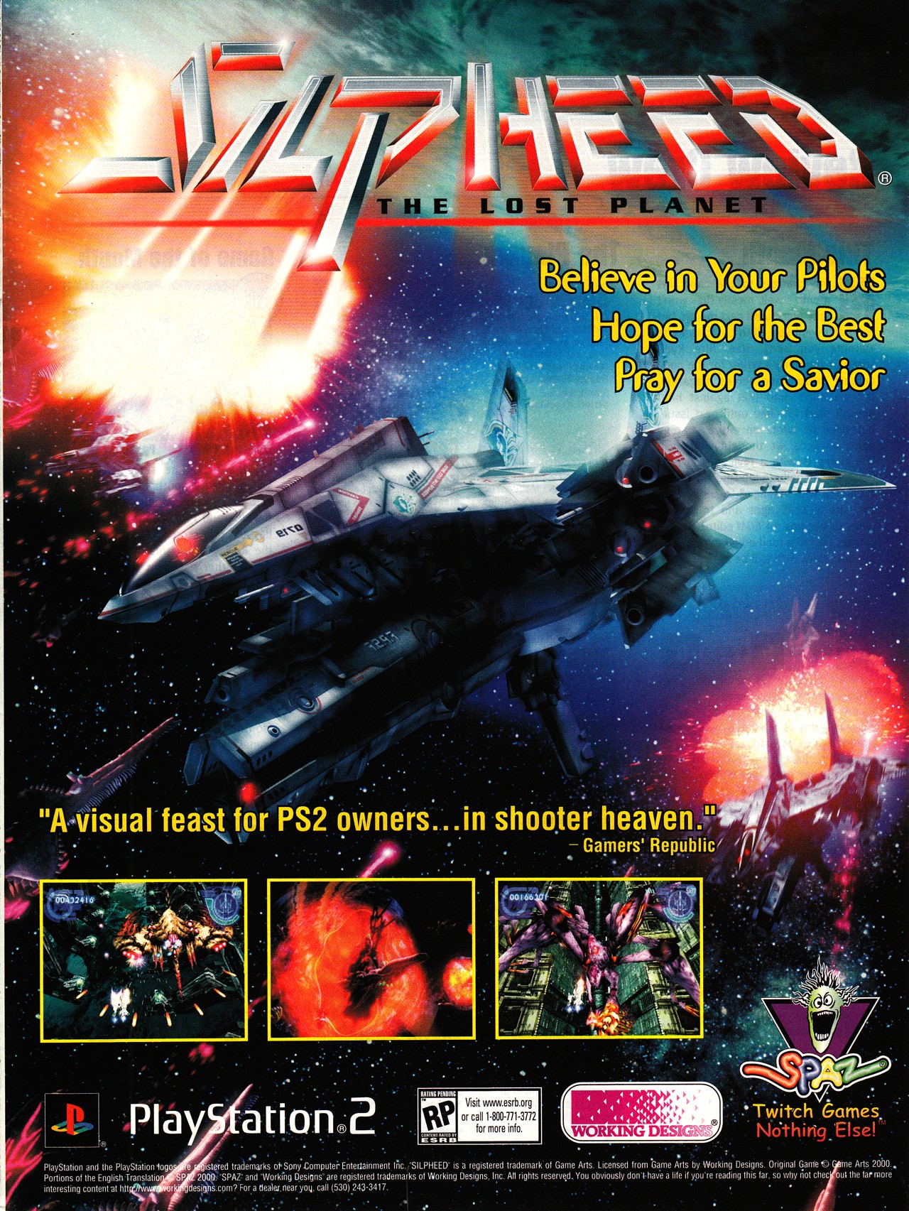 Now that we've had a chance to play the PS2 edition of Silpheed, we have a few concerns. We know Working Designs plans to add analog control before the game hits shelves this fall, but we're wondering if they plan to do anything about the massive slowdown found in many of the levels as well. There probably isn't a big chance of that happening. However, fans of the Sega CD game of old will recognize the option to load different weapons on each side of their ship, earn new weapons based on their performance in each level, and even relive some of the great music from the first game. The real question is whether the nostalgia factor will be enough for new PS2 owners to spend the dough. Look for our review next month.