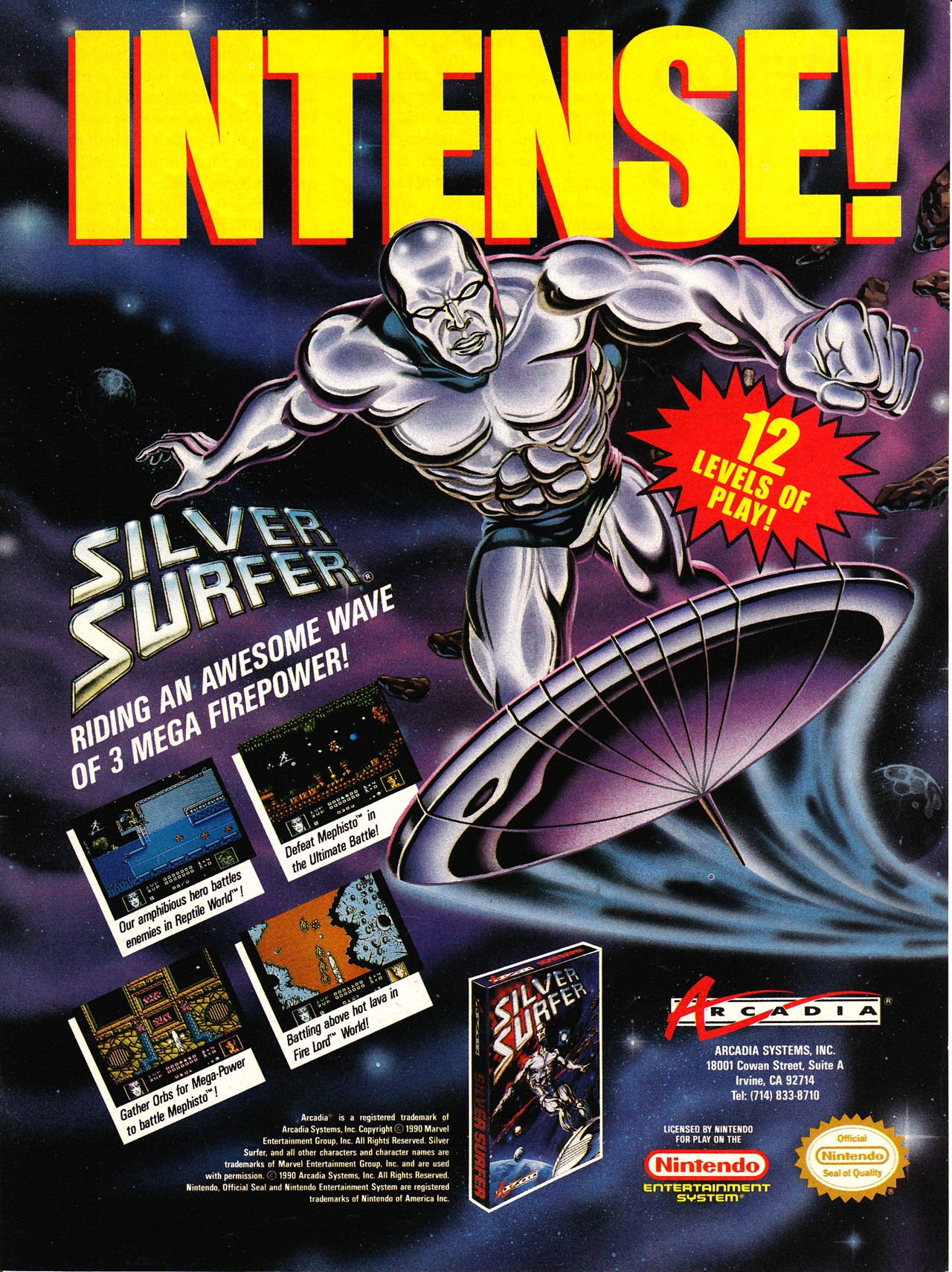 Comic book fans everywhere know the heartbreaking tale of the Silver Surfer, the star-crossed Marvel Comics hero cursed by the heartless, god-like Galactus to wander the universe alone on his super surfboard. Arcadia Systems' Silver Surfer may doom NES shoot-em-up lovers to a similarly bleak fate.