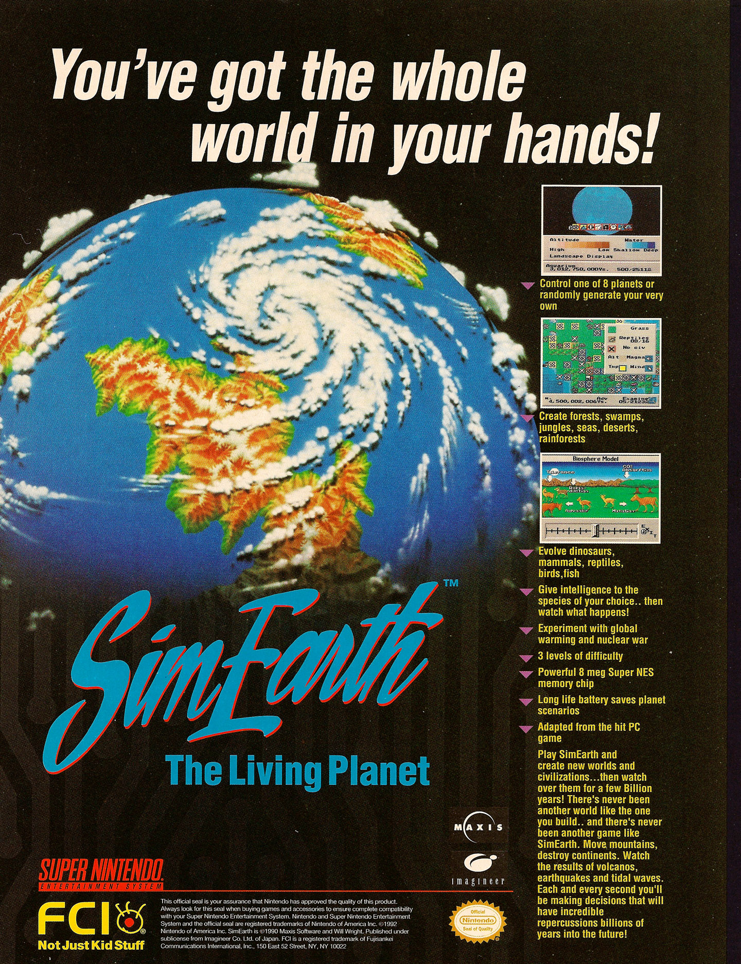 FCI is bringing another top-selling computer Software Toy, SimEarth, to the SNES. SimEarth is a complex, but impressive, planet simulator. With a little help from this toy, and a lot of help from your own brain cells, you can create and manage your own world by manipulating its environment.