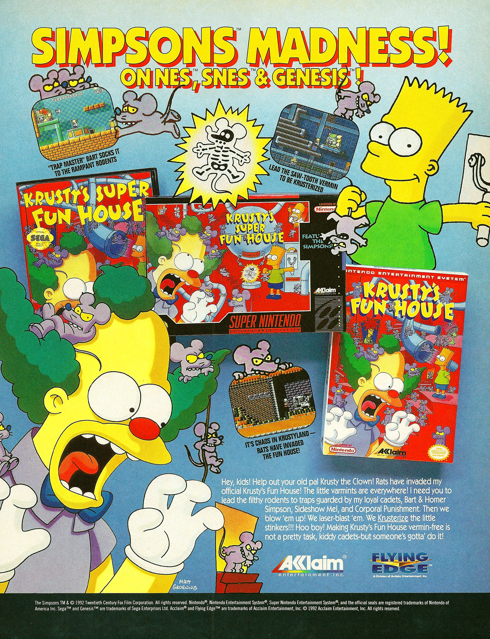 Aye carumba! Krusty the Clown's Fun House has been invaded by a pack of vile vermin. In this one-player, puzzle/action game from Flying Edge, Krusty, Bart, Homer, Sideshow Mel, and Corporal Punishment team up as the craziest extermination team on record.