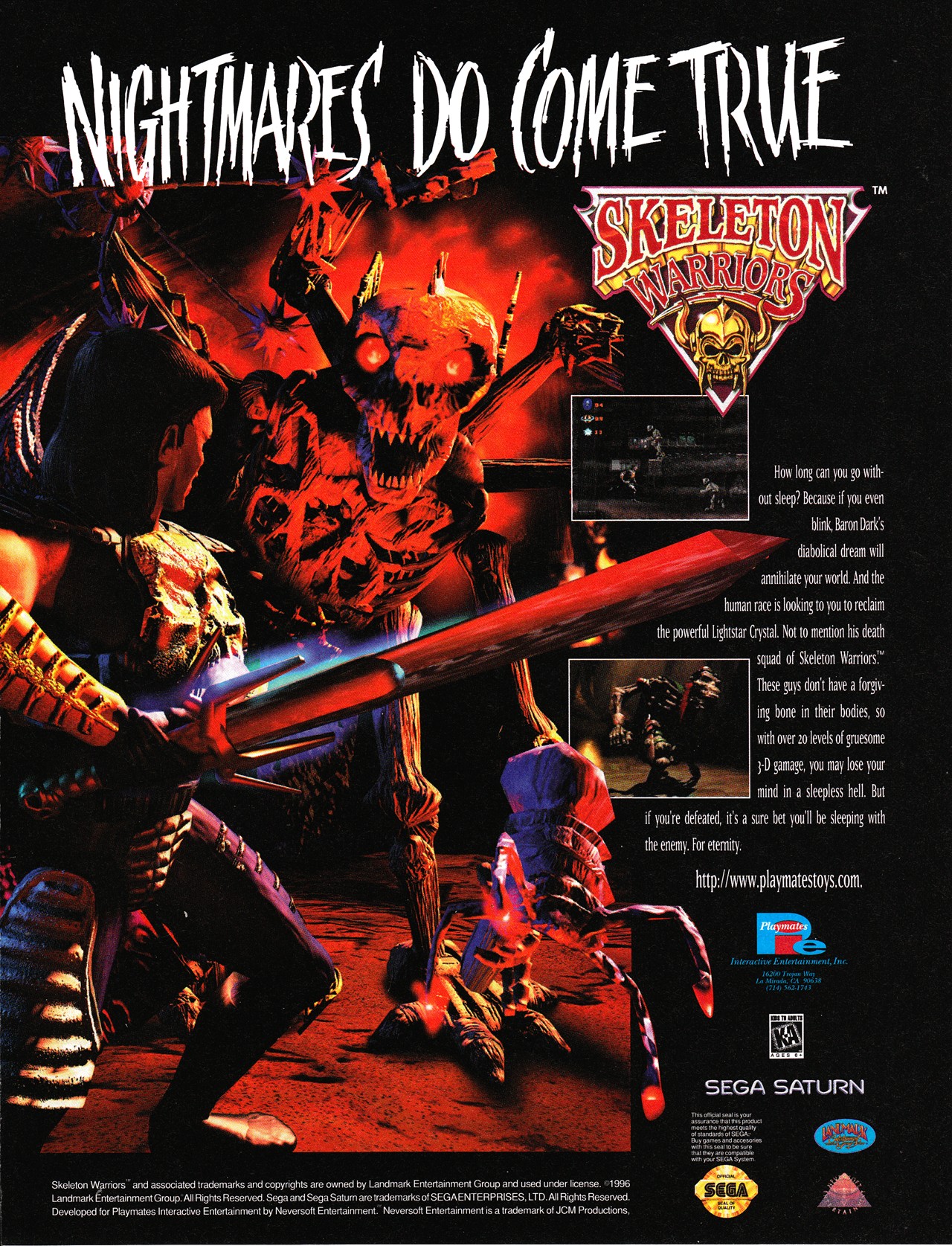 Good Lord! After months of dull Saturn games, the 32-bit Sega machine is finally getting its share of nifty software. Skeleton Warriors is a fine example of what can be achieved with even conventional game styles on the powerful platform. "Borrowing" heavily from Rastan and games of that ilk, you play the part of a sword-swinging warrior, on a quest to retrieve half of a powerful crystal from some bad guy.The plot borders on retarded, but the game most definitely is not. 3D backgrounds and foregrounds (a la Clockwork Knight) portray the violent, fast-paced fun. You have a sword, a gun, a shield and a couple of tricks up your sleeve.The baddies don't have a chance. Music? The best ever heard on the Saturn. Seriously. It's creepier than a big bag of creepy things with a special reason for making you nervous. Cool!