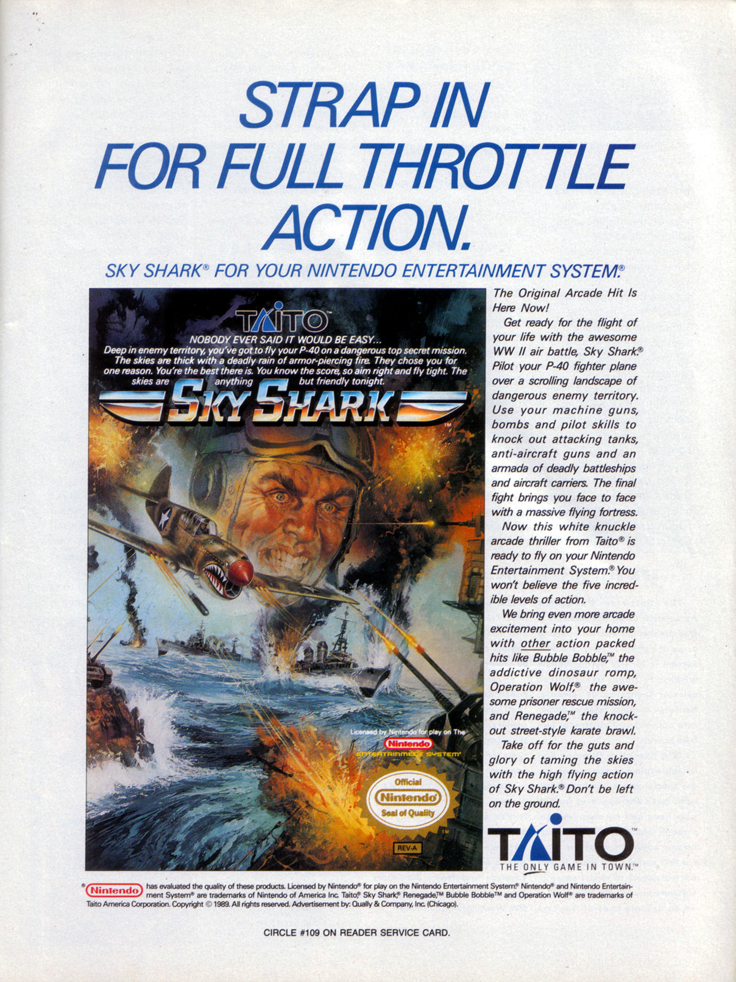 Get ready for the flight of your life with the awesome WW II air battle, Sky Shark? Pilot your P-40 fighter plane over a scrolling landscape of dangerous enemy territory. Use your machine guns, bombs and pilot skills to knock out attacking tanks, anti-aircraft guns and an armada of deadly battleships and aircraft carriers. The final fight brings you face to face with a massive flying fortress. Now this white knuckle arcade thriller from Taito is ready to fly on your Nintendo Entertainment System. You won't believe the five incredible levels of action. We bring even more arcade excitement into your home with other action packed hits like Bubble Bobble? the addictive dinosaur romp, Operation Wolf? the awesome prisoner rescue mission, and Renegade? the knockout street-style karate brawl.