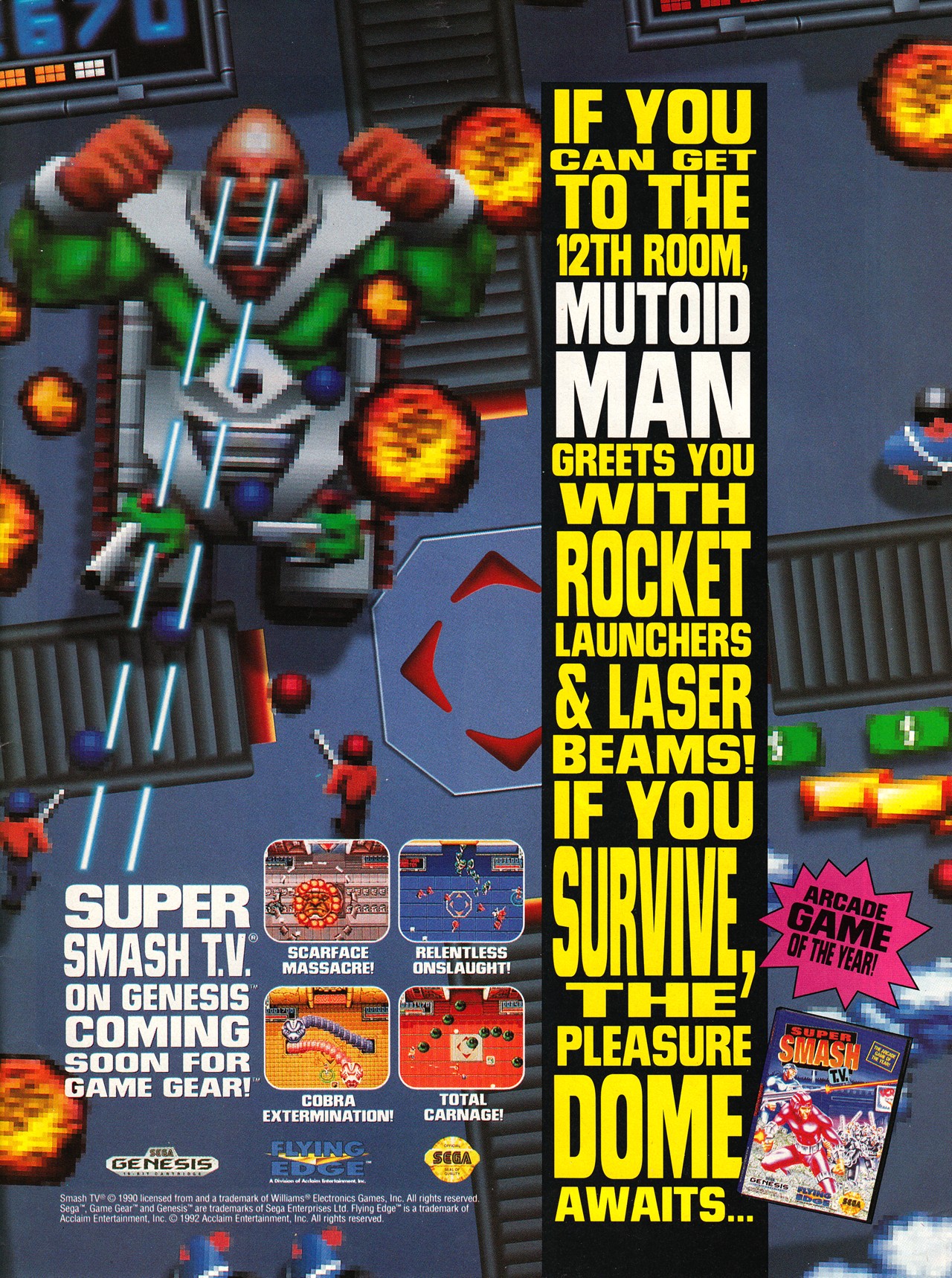 You heard it right, folks! The famous arcade game that combined winning prizes and slaughtering thousands of creatures is about to make it's way to the homes of all Genesis owners! It is far into the future, and the most popular form of entertainment is the game show Smash TV, where the contestants win incredible prizes or lose their lives.